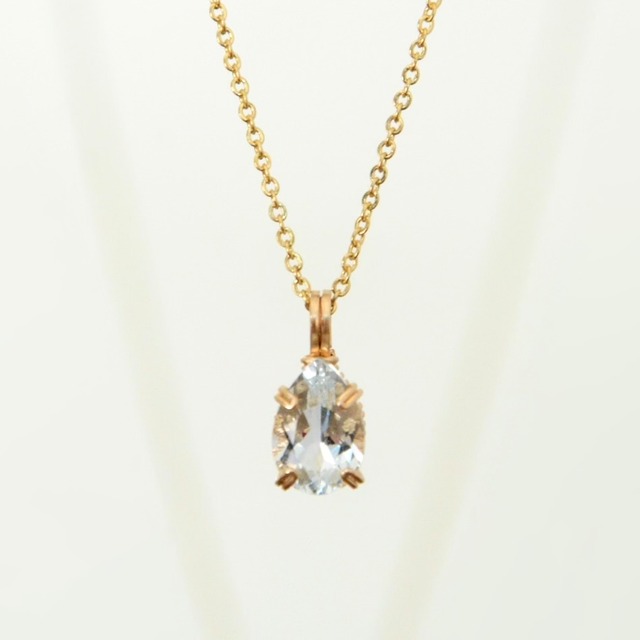 みずみずしい輝きを放つペアシェイプカットのアクアマリンをあしらったワイヤーペンダント。 透明感のあるライトブルーが美しく、すっきりとしたシルエットが胸元に上品で清らかな印象を添えてくれます。 アクアマリンの魅力が引き立つシンプルなデザインに仕上げました。 チェーンにはスライドボールを使用し、お洋服やその日の気分に合わせて、長さを自由に調整してお楽しみいただけます。 また、チェーンエンドには14kgfのコインプレートをあしらい、後ろ姿にもさりげないアクセントを添えました。 日々の装いにはもちろん、特別な日の装いにもおすすめのペンダントです。 ▽アクアマリン アクアマリンは、透明感のある青い色合いが特徴です。ラテン語で「海の水」を意味する「aqua marina」に由来しており、海や水との関係が深い宝石です。 3月の誕生石としても知られ、心を穏やかにして平穏な気持ちをもたらすと言われ、ストレスや不安を和らげる効果があるとも伝えられています。 さらに、アクアマリンには「船乗りに恋をした人魚が叶わぬ恋に涙を流し、その涙が宝石になり打ち上げられ、それを船乗りが身につけてお守りにした。」という素敵な逸話があり、そうしたことから「人魚の涙」と表現されることもあります。 【ギフト仕様について】 当ショップでは、無料でギフトラッピングを承っております。 リボンのお色もお選びいただけます。 ご希望の方は、商品ページのオプションよりリボンカラーをご選択ください。 ※手提げ袋は付属しておりません。 【Detail】 ○ チェーンの長さ 全長約45cm (長さ調整可能) 小豆チェーン 14kgf ○ ペンダントトップ 全長約1.4cm ♢ ワイヤーフレーム 14kgf ♢ アクアマリン ペアシェイプカット 約9×6mm ♢ そのほか金属すべて 14kgf