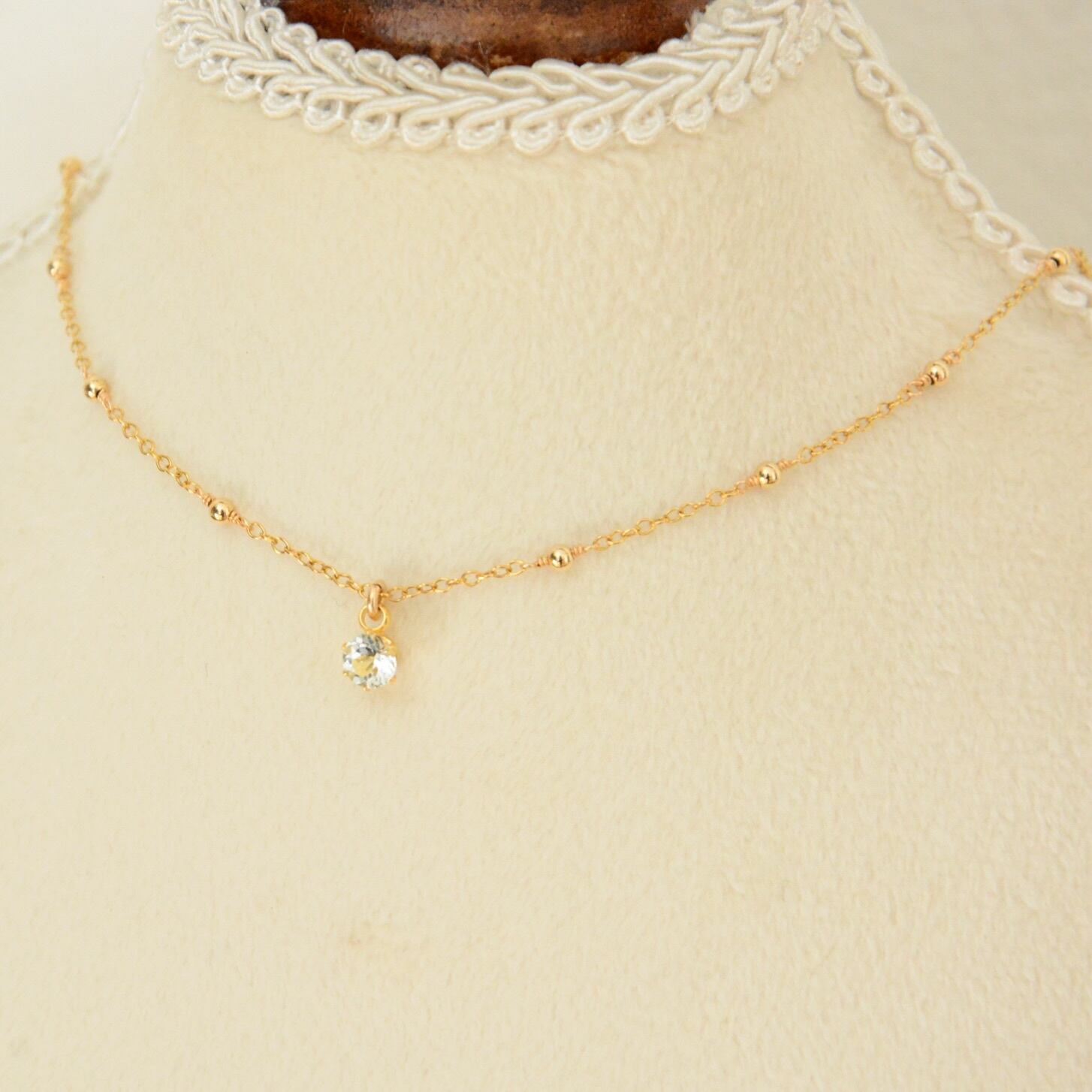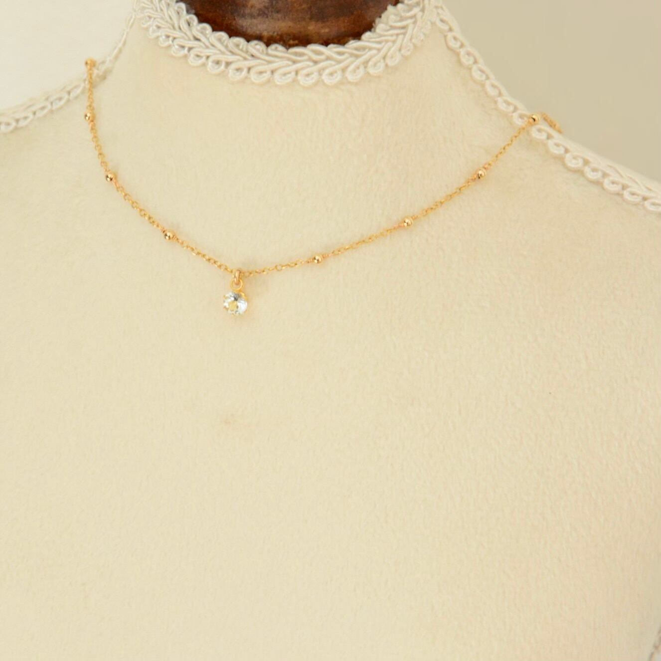 チェーンの間に14kgfメタルビーズを配置したステーションチェーンとアクアマリンの一粒ペンダント。