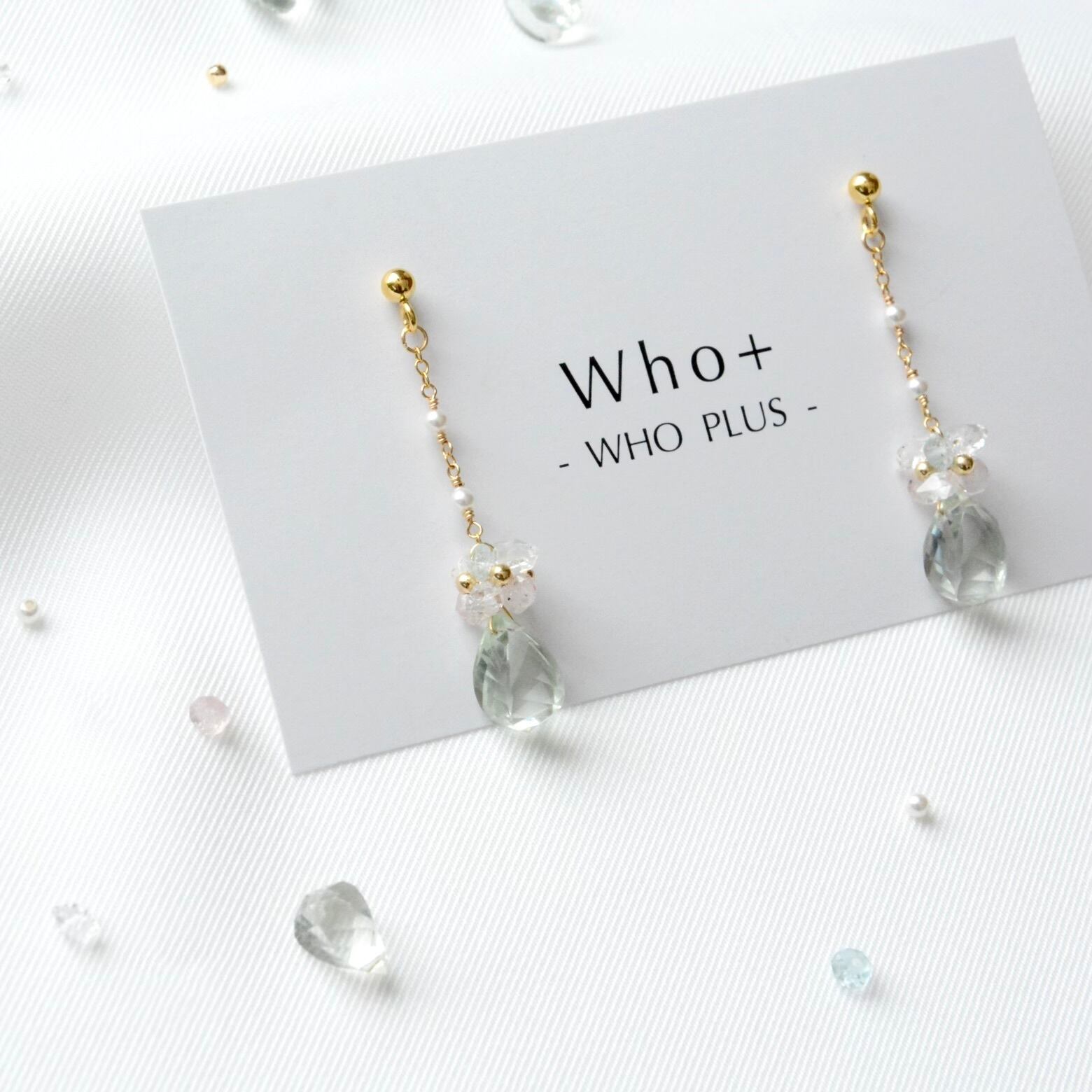 花冠にはアクアマリン、モルガナイト、ハーキマーダイヤモンドといった天然石があしらわれ、優しい色合いで耳元を彩ります。これらの石の繊細な輝きがまるで花が咲いたような華やかさを演出。