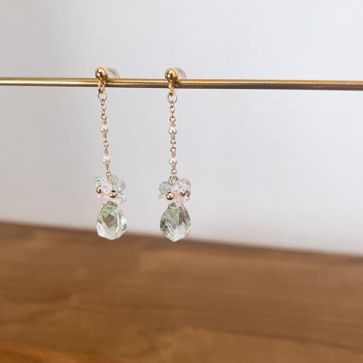 華やかで優雅な耳元を演出するグリーンアメシストに花冠を乗せた耳飾り。
