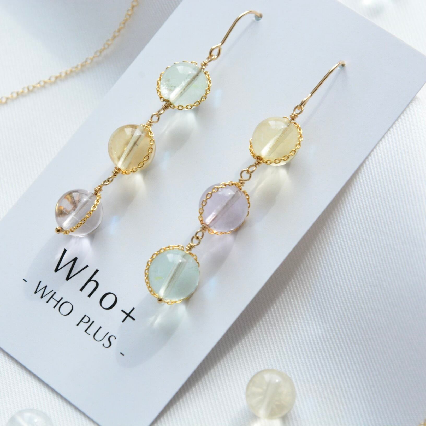 色とりどりのフローライトが透明感を引き立て、まるで水滴が輝くようなみずみずしさを感じさせる耳飾り。