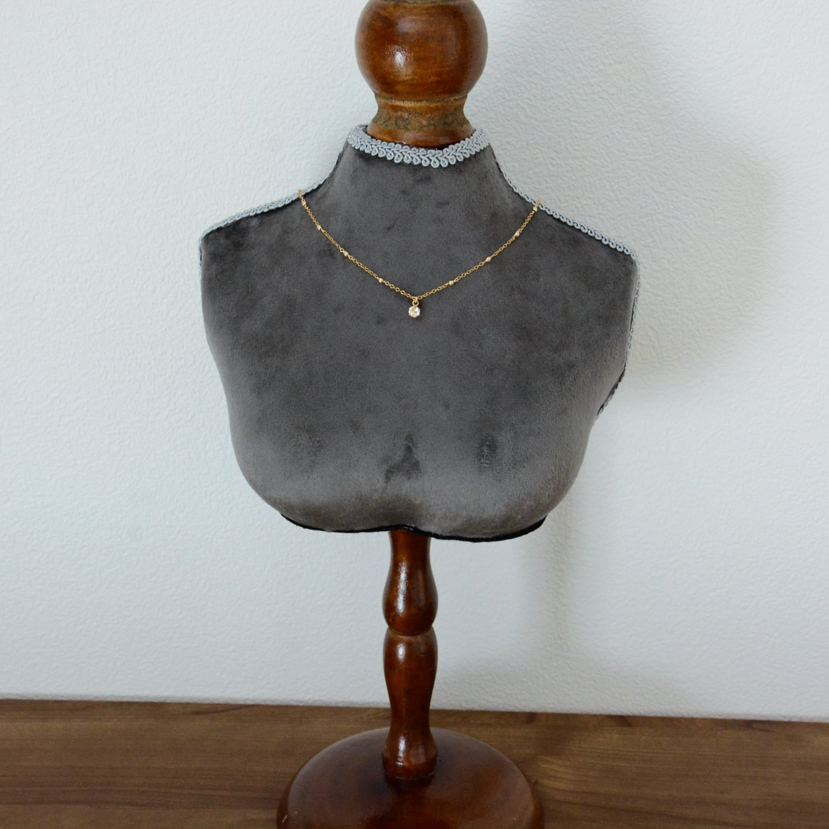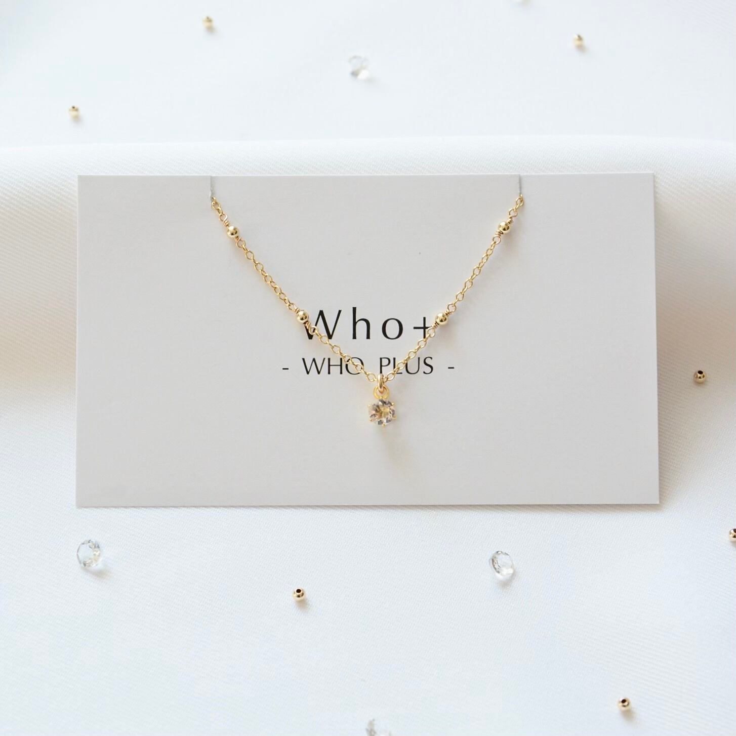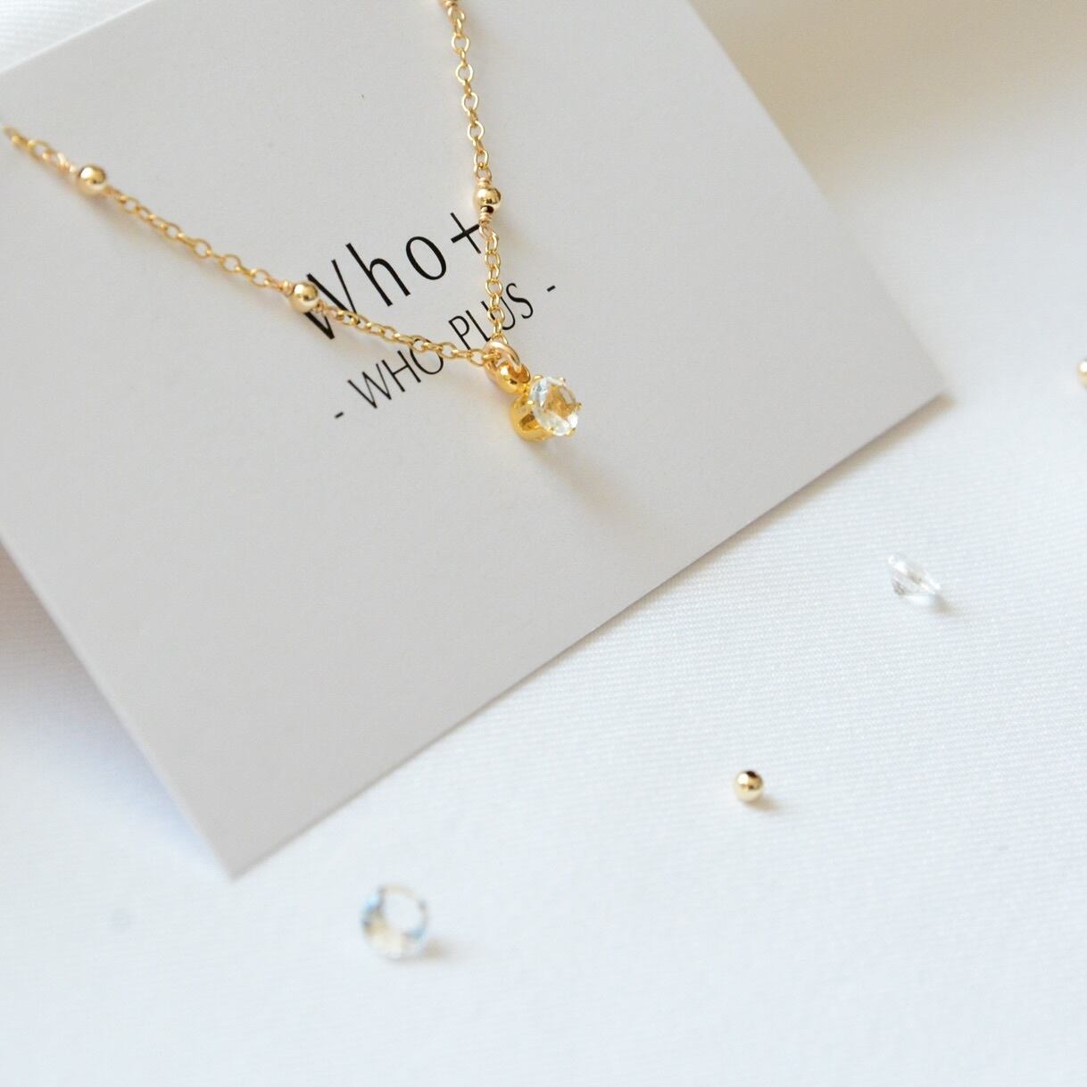繊細なデザインのステーションチェーンに、ほんのりときらめくホワイトトパーズをあしらった一粒ペンダント。