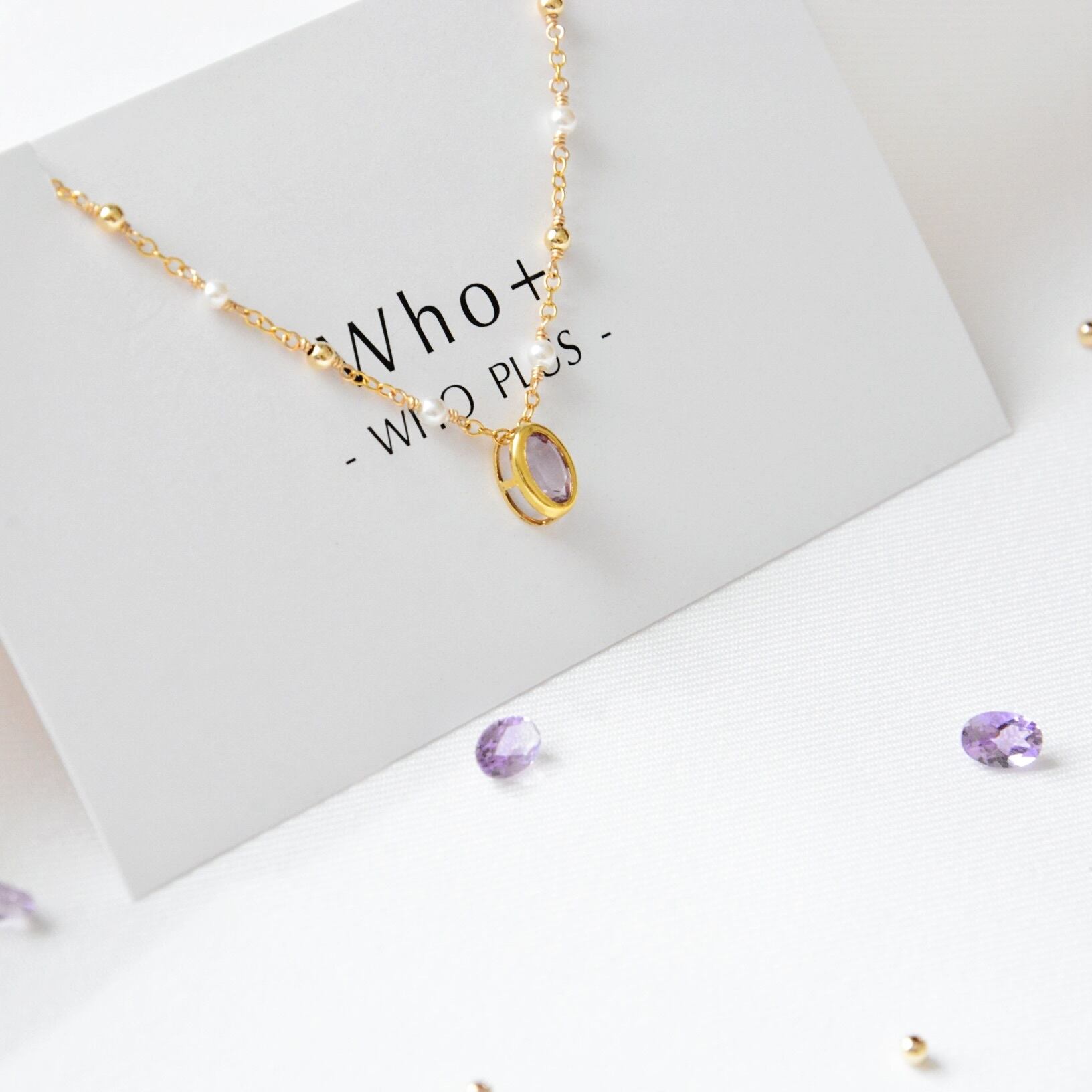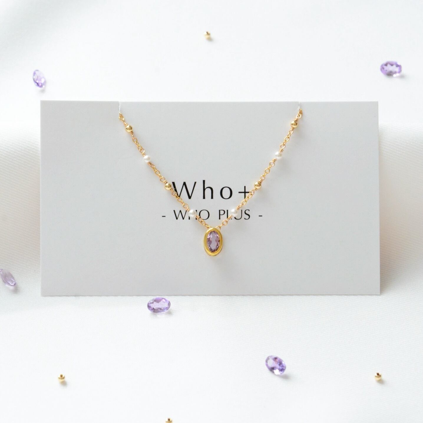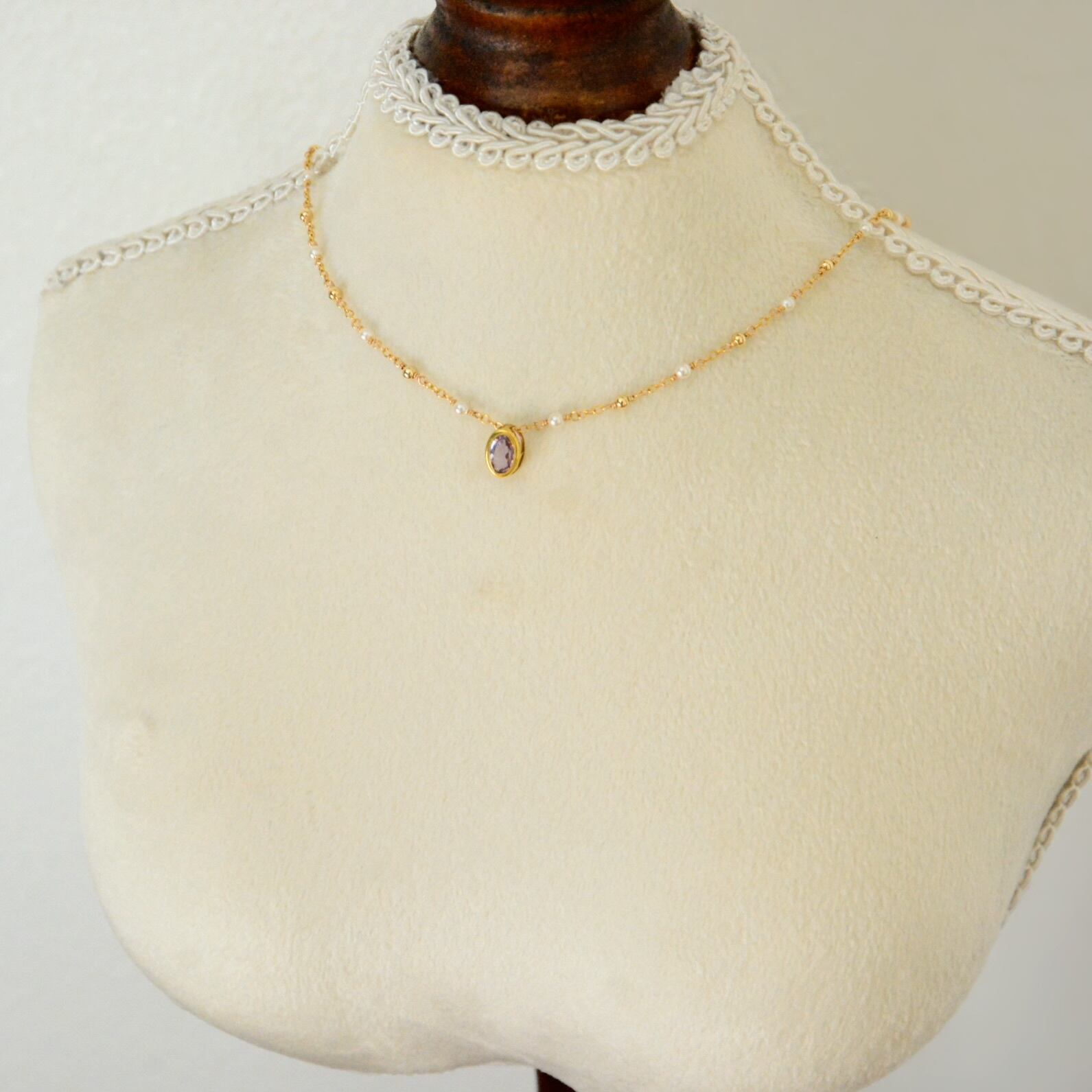 クリスタルパールとメタルビーズで繊細に仕立てたデザインチェーンに、オーバルファセットカットのアメシストをひと粒あしらったペンダント。
