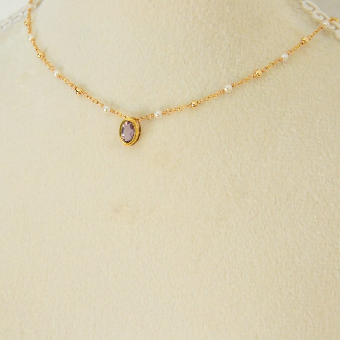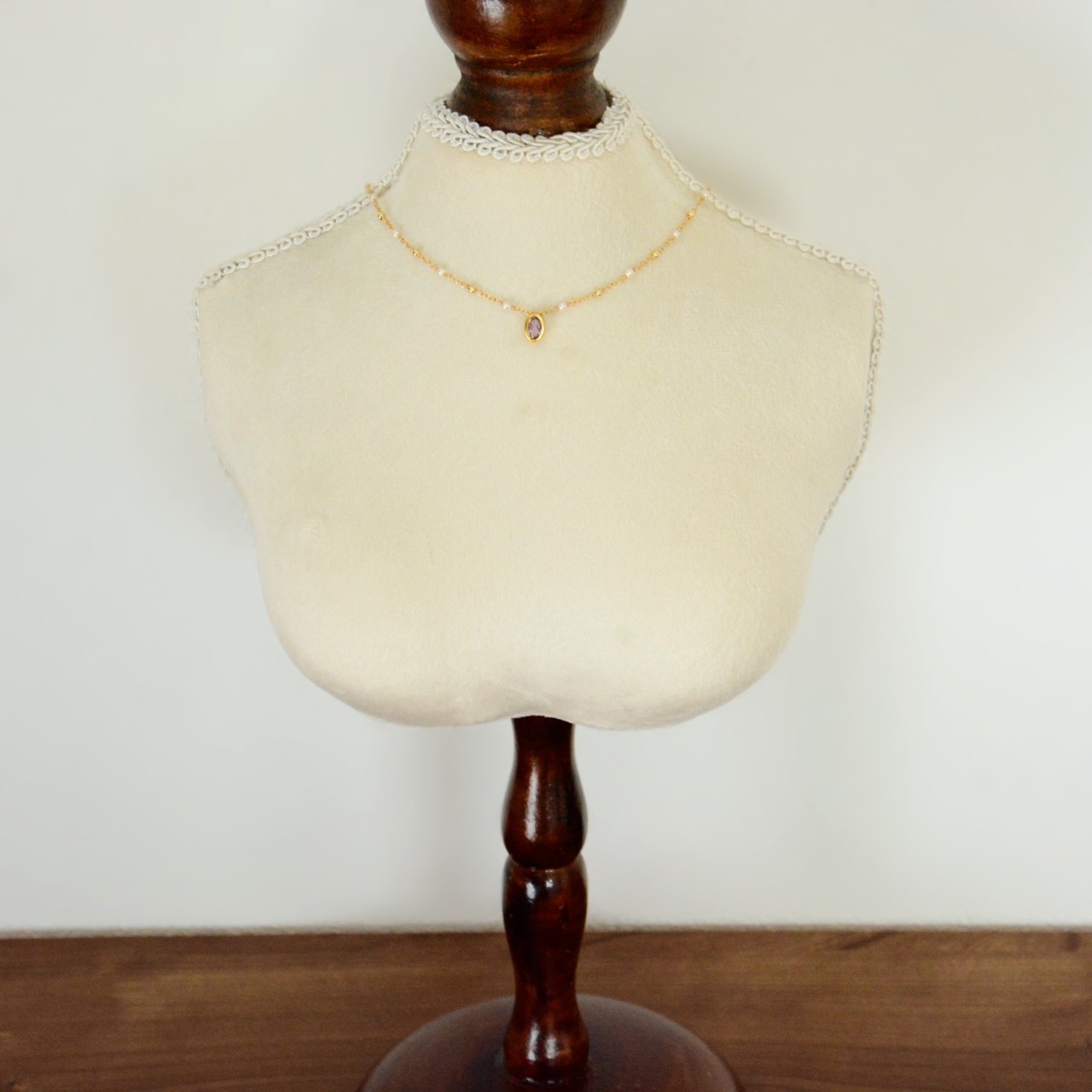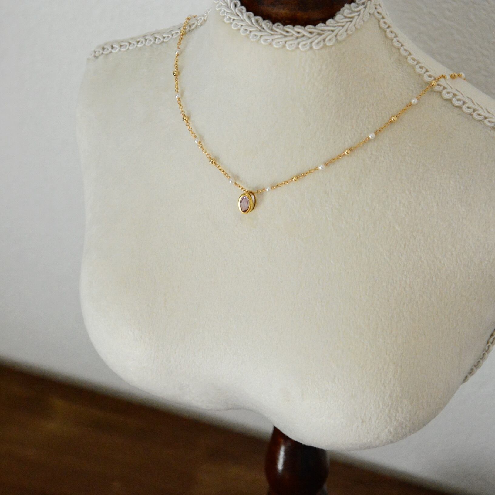 クリスタルパールとメタルビーズで繊細に仕立てたデザインチェーンに、オーバルファセットカットのアメシストをひと粒あしらったペンダント。