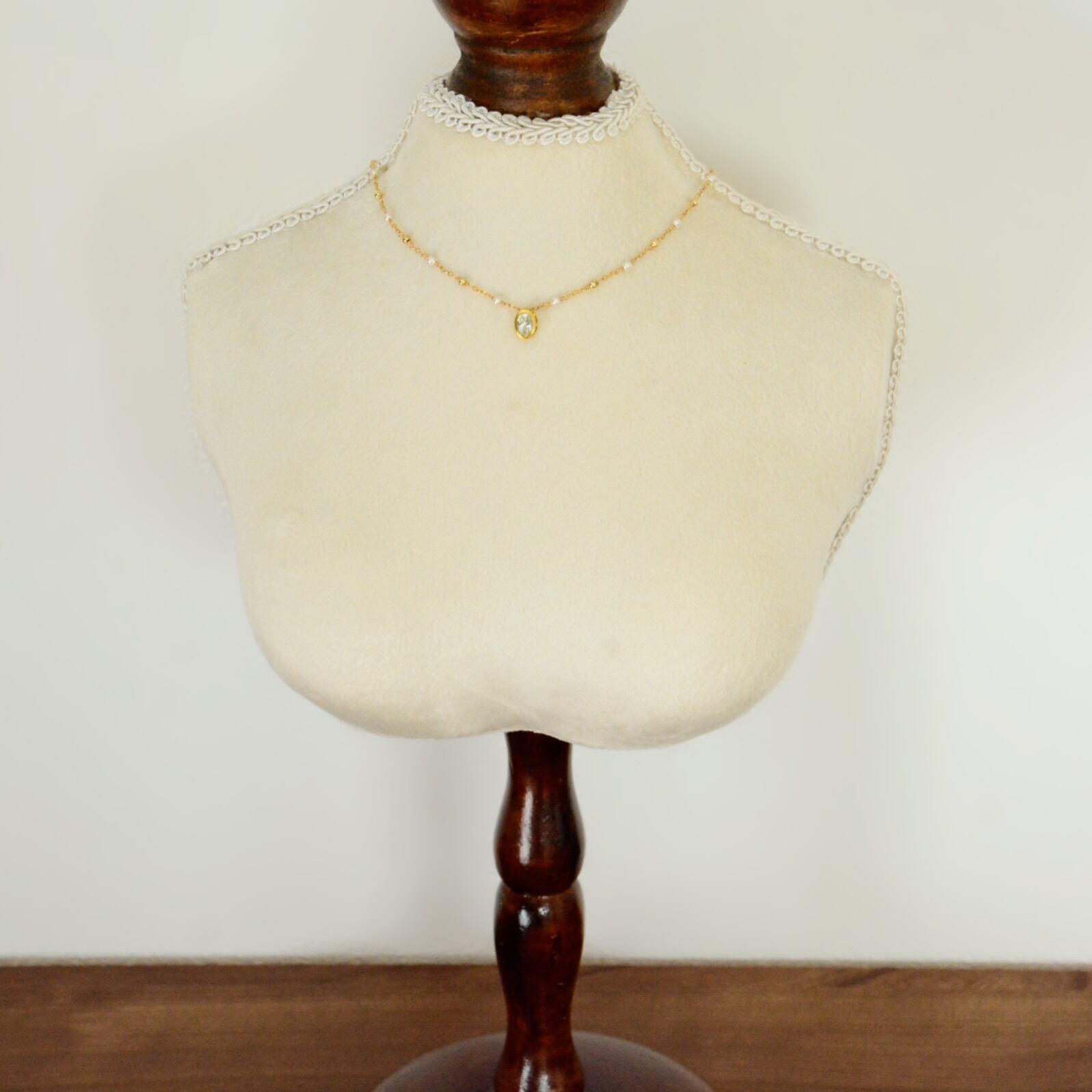 チェーンにはメタルビーズとパールをあしらい、どこかクラシカルなアンティーク感と、可愛らしさの中にエレガンスを演出しています。
