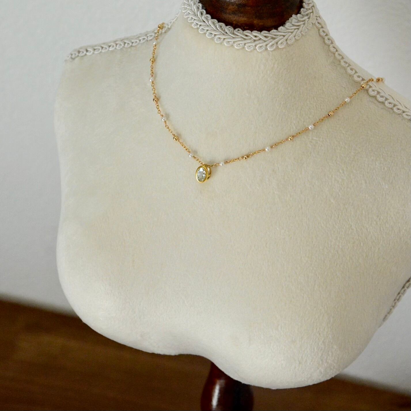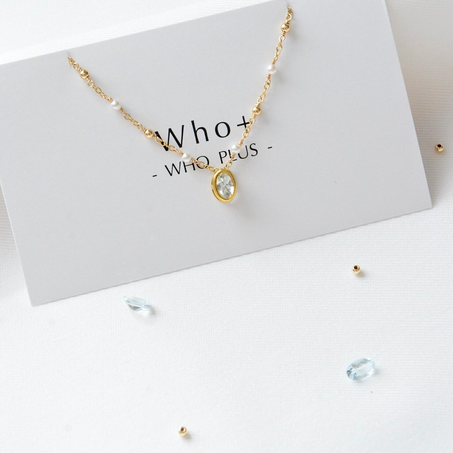 瑞々しい輝きを放つアクアマリンをベゼルセッティングで包み込んだペンダントネックレス。