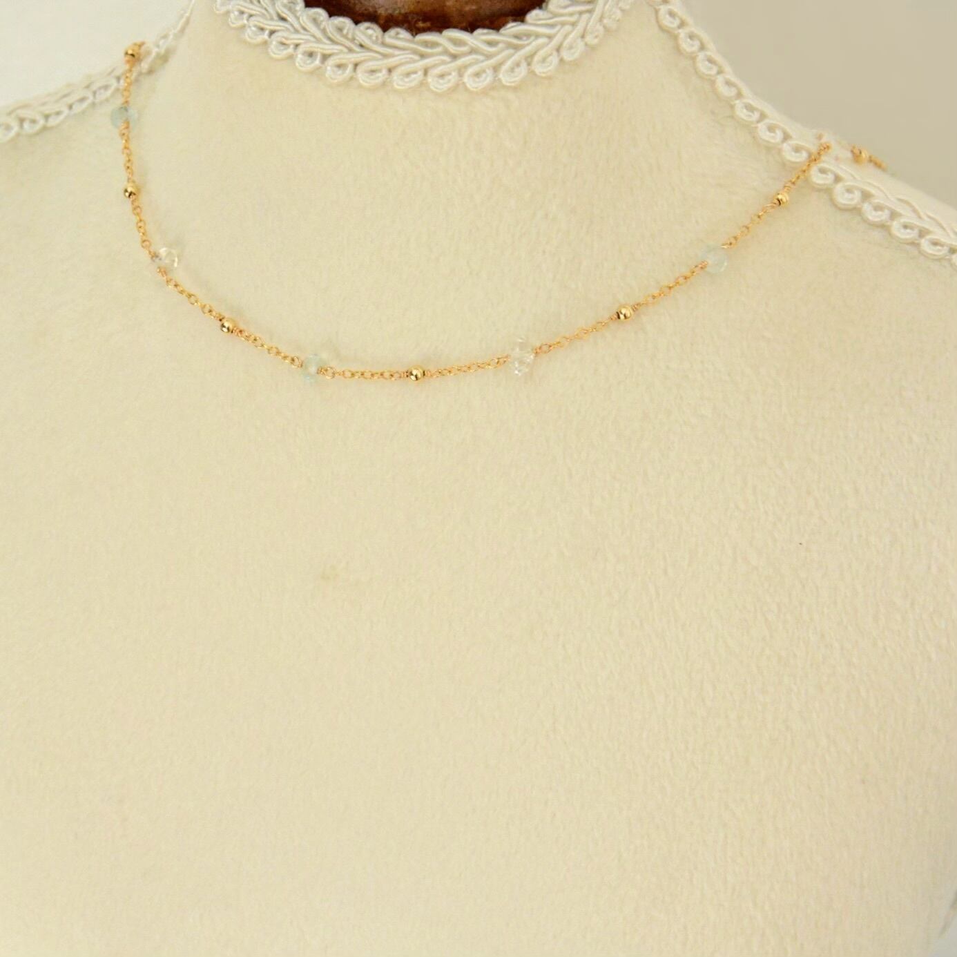 繊細なゴールドビーズとチェーンは天然石の美しさを一層引き立て、洗練された印象に。
