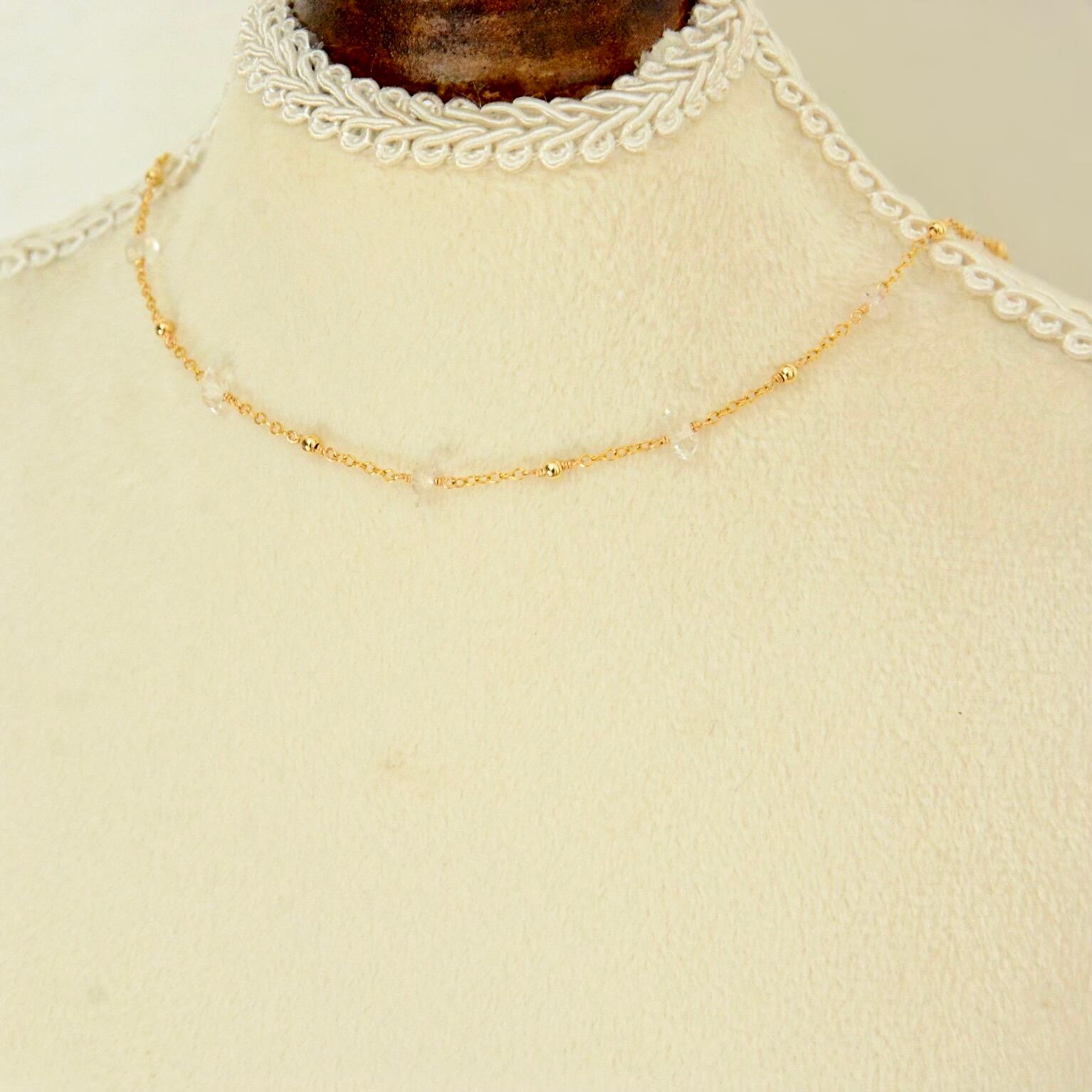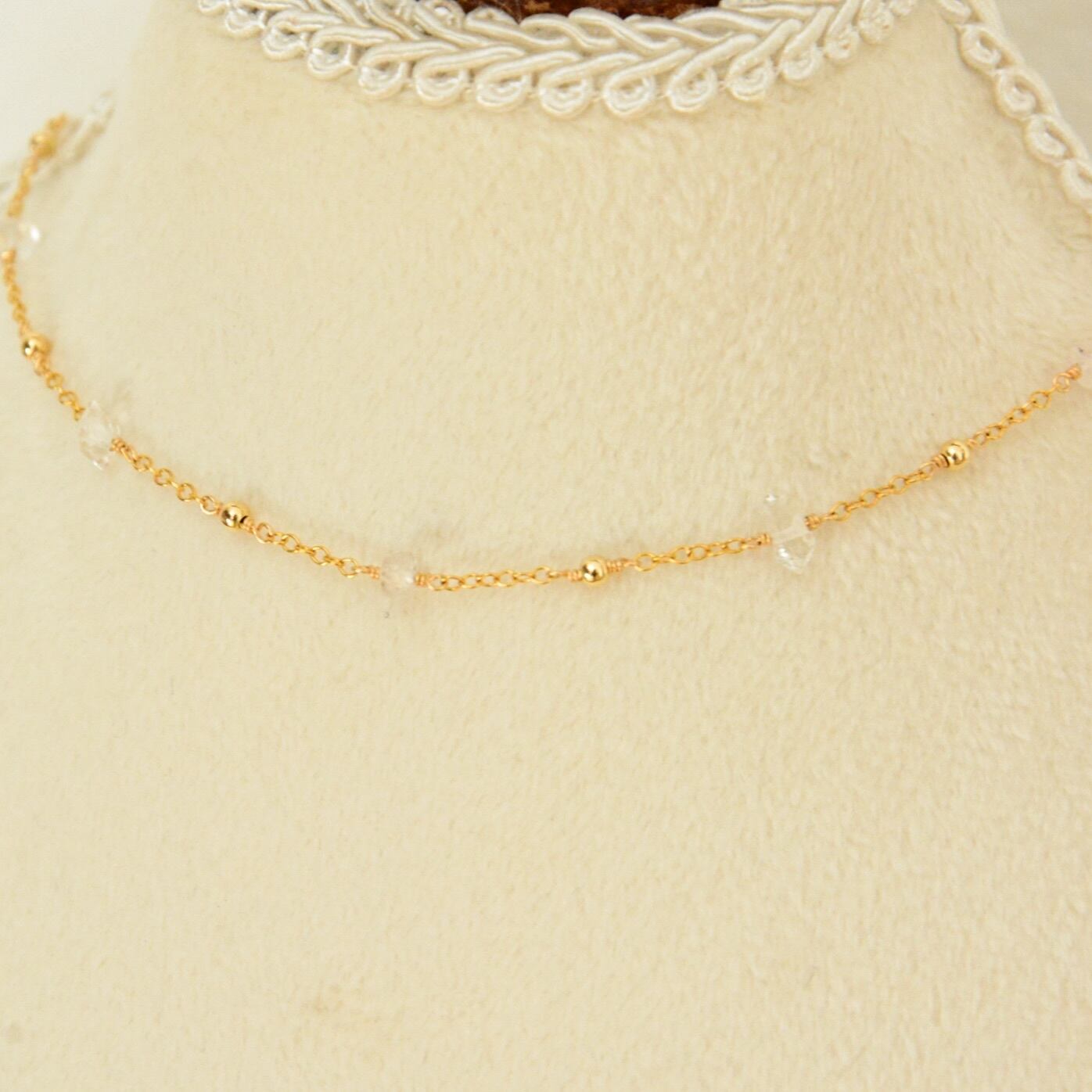 異なる個性をもつ天然石にゴールドビーズをアクセントに添えたステーションネックレスです。