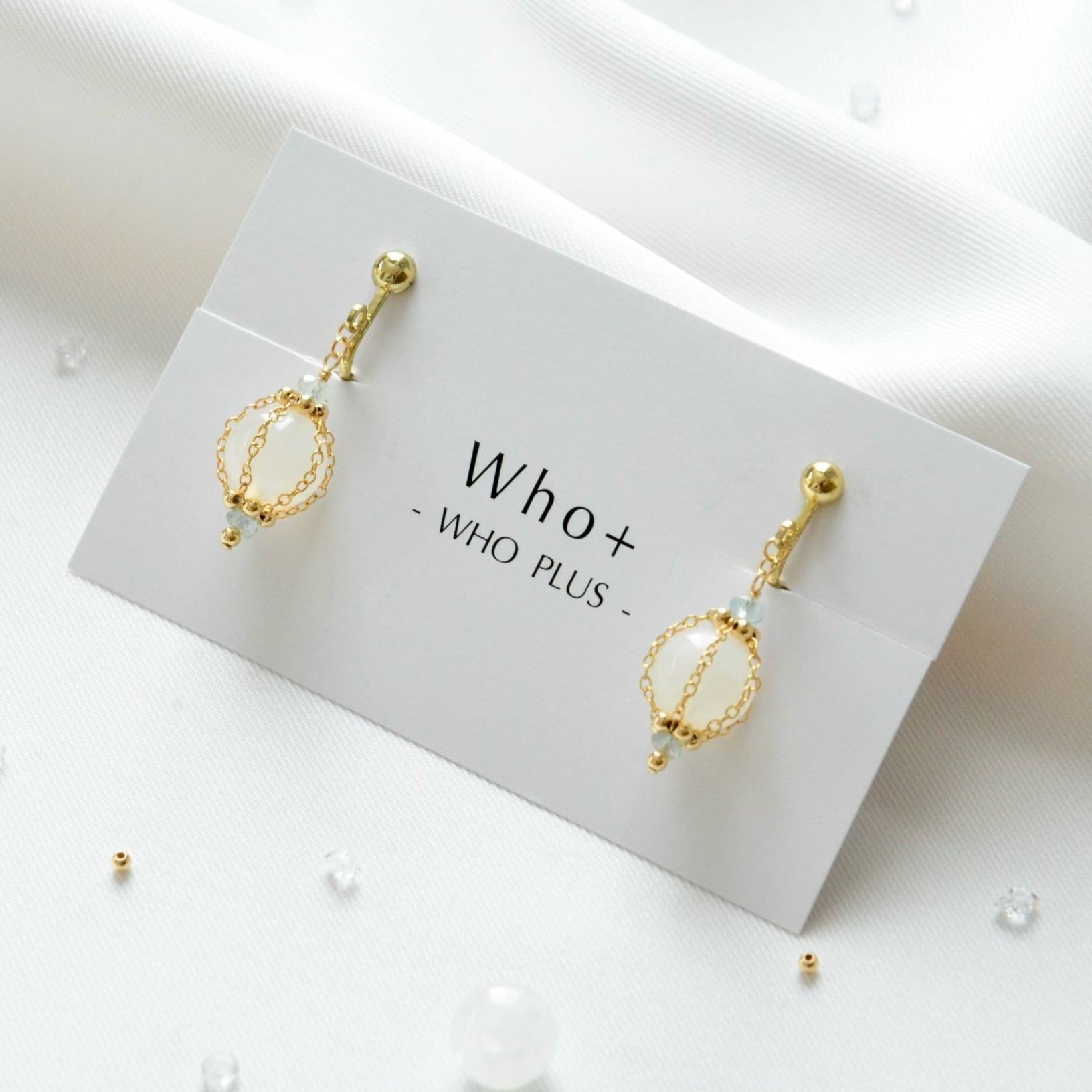 月のような青白い光を感じさせるムーンストーンに繊細なチェーンラッピングを施した耳飾り。