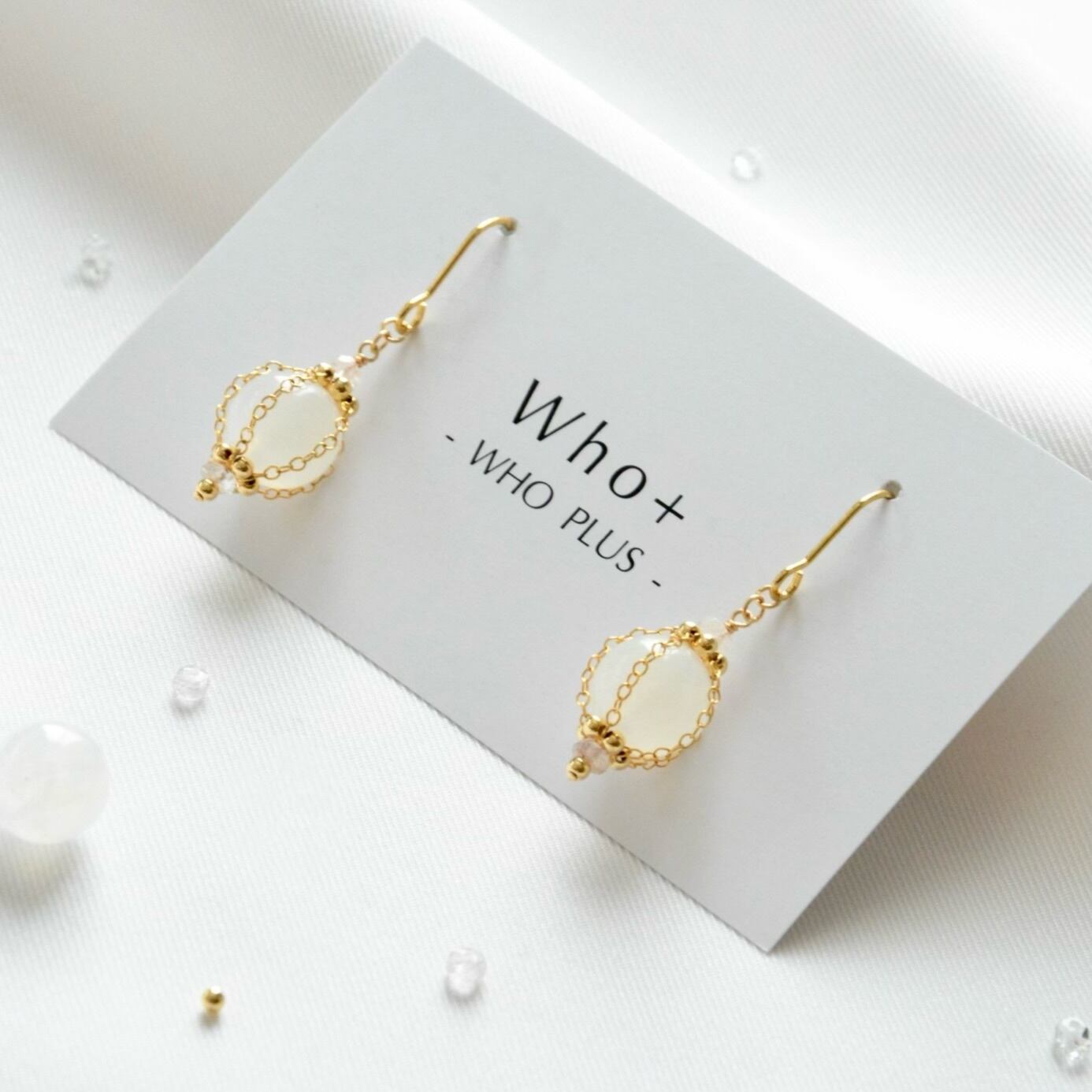 月のような青白い光を感じさせるムーンストーンに繊細なチェーンラッピングを施した耳飾り。