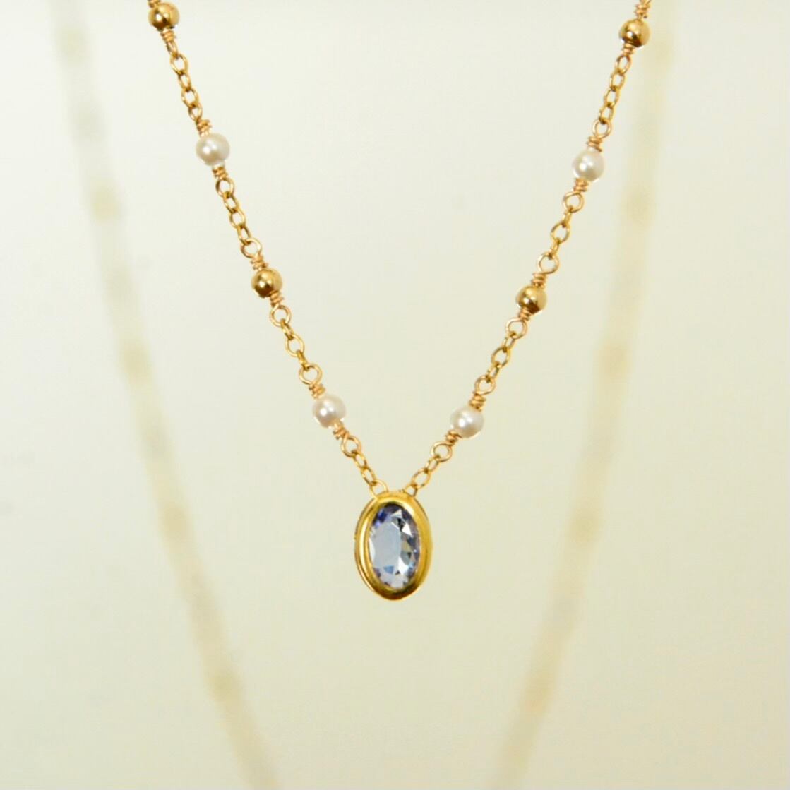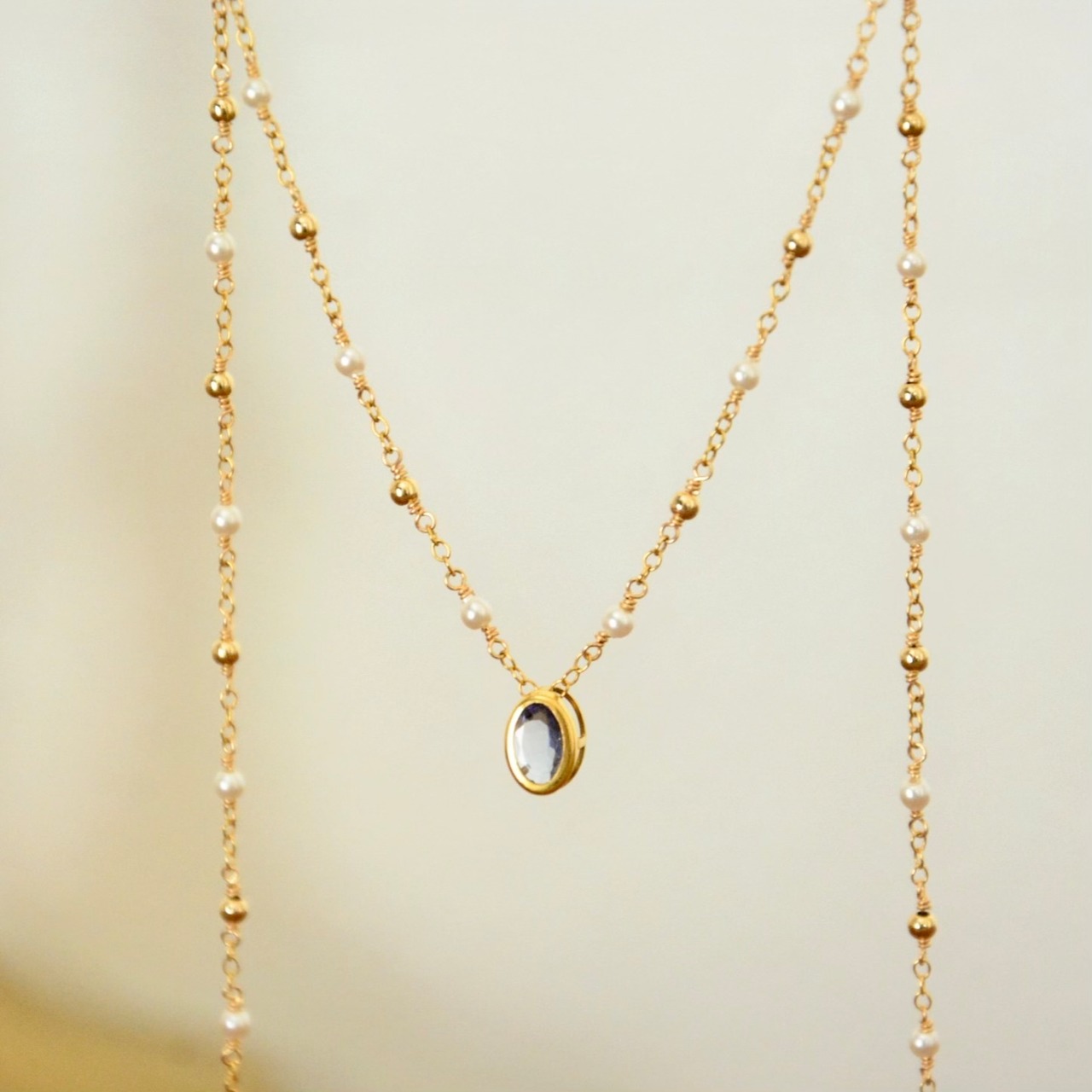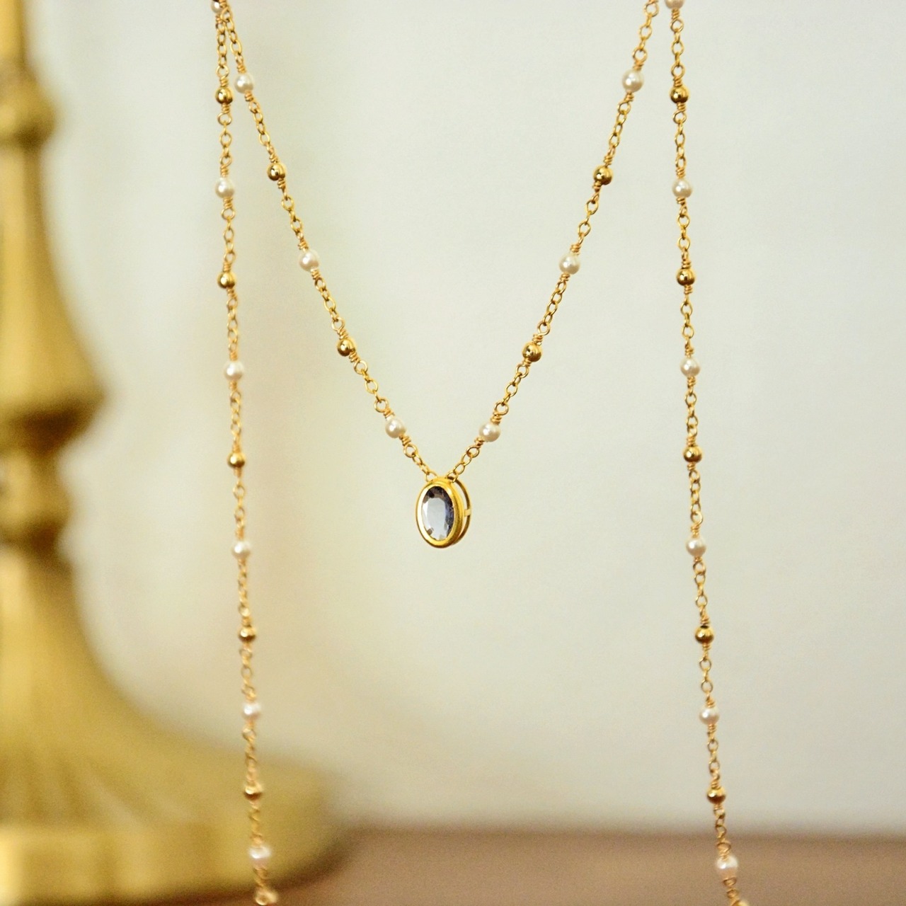 チェーンはメタルビーズとパールを組み合わせたステーションデザイン。