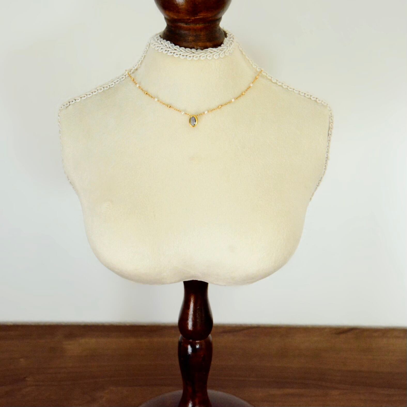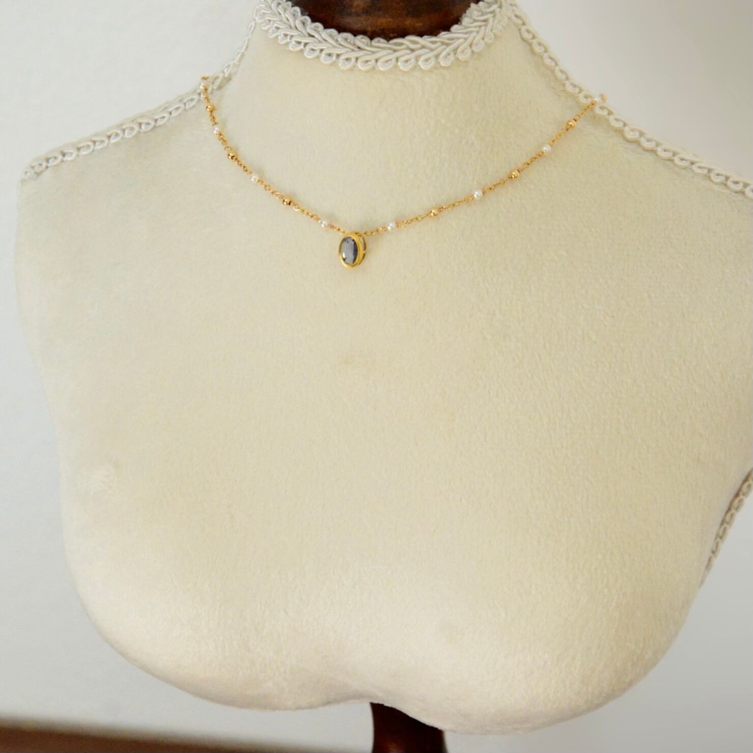チェーンはメタルビーズとパールを組み合わせたステーションデザイン。アンティークのようなクラシカルな雰囲気が胸元にさりげない華やかさと個性をプラスします。
