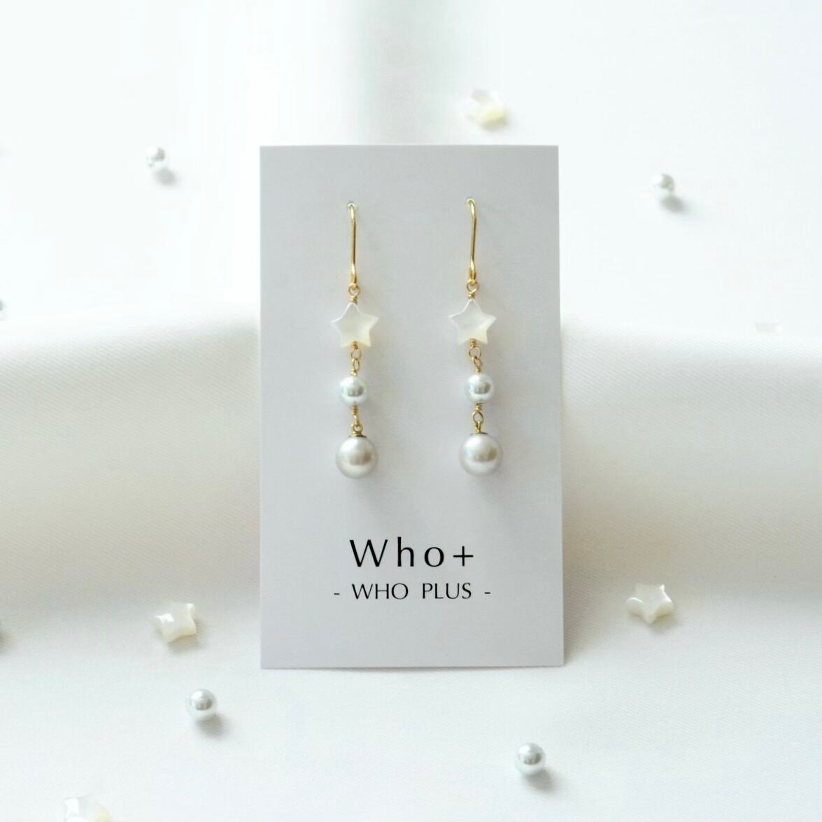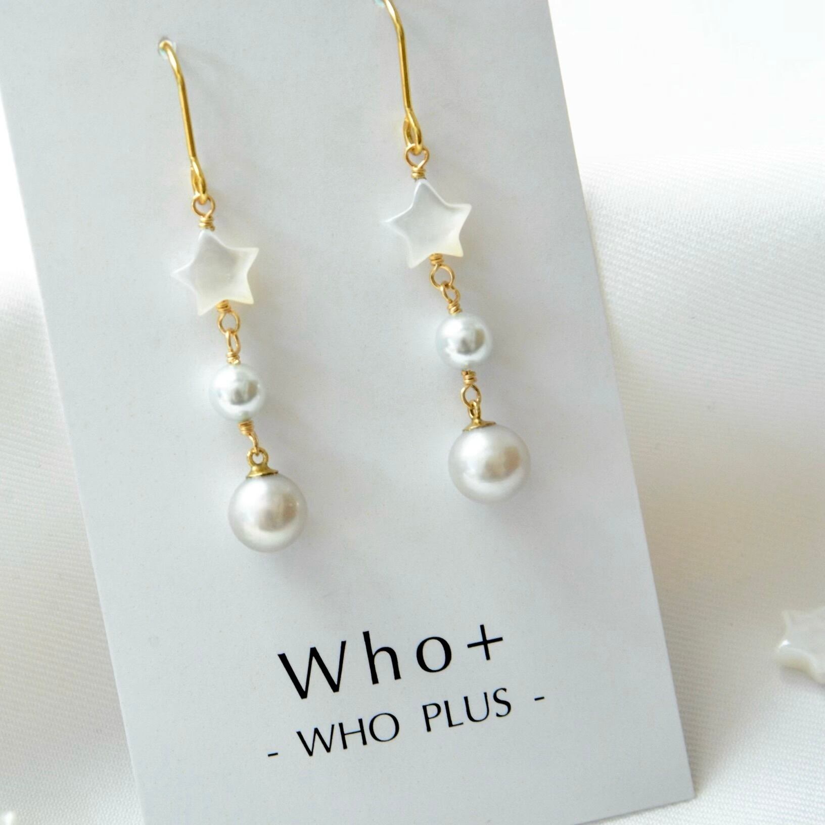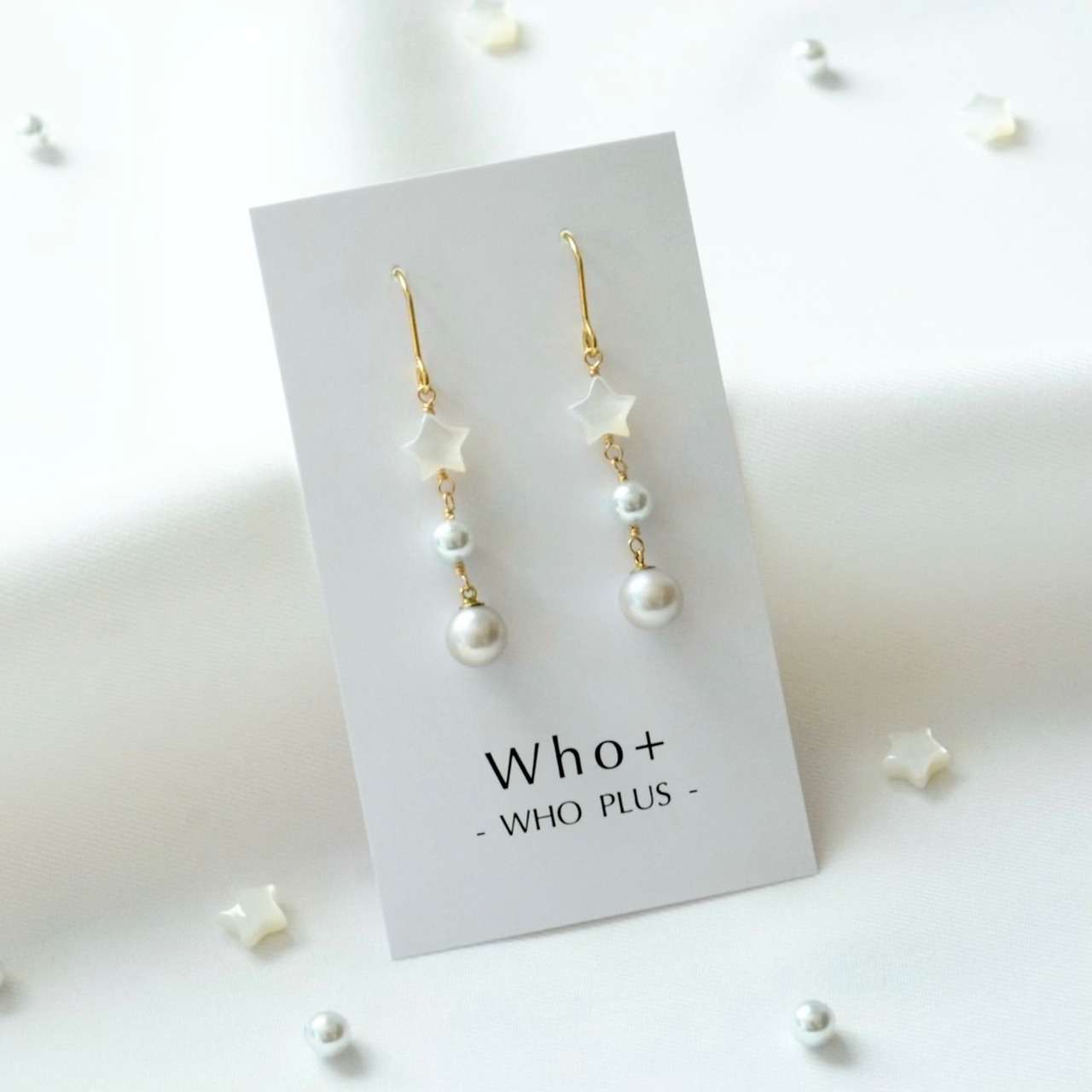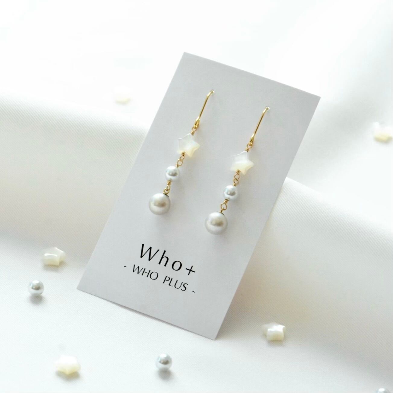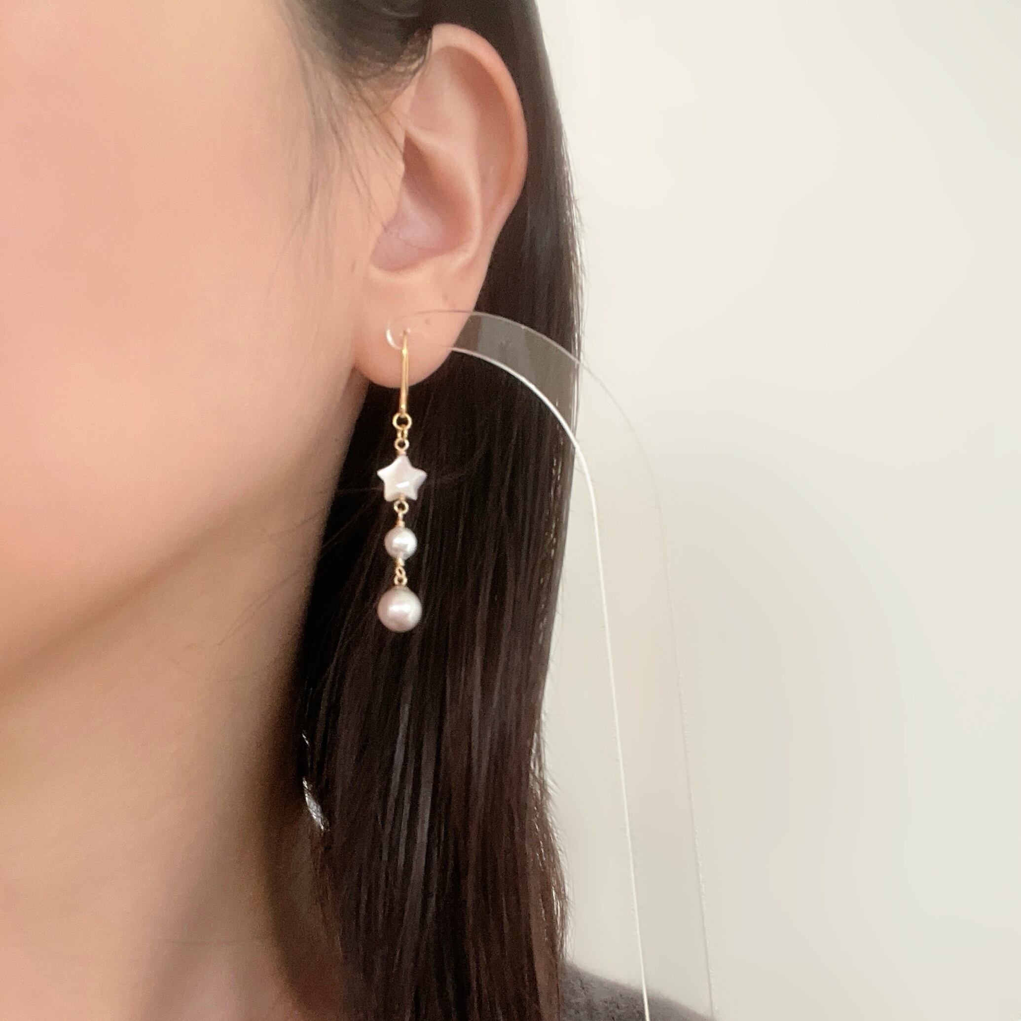 ミルキーカラーの星型ホワイトシェルが目を引く遊び心のある大人の耳飾り。