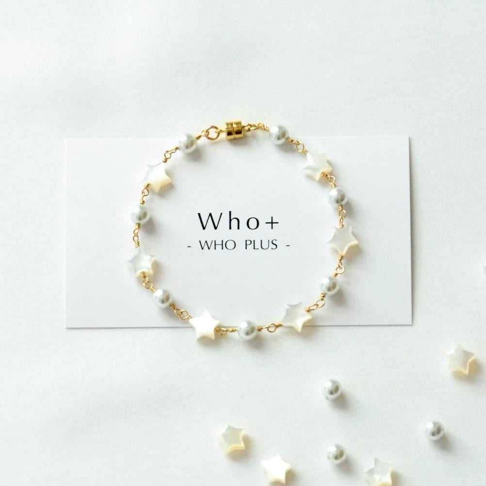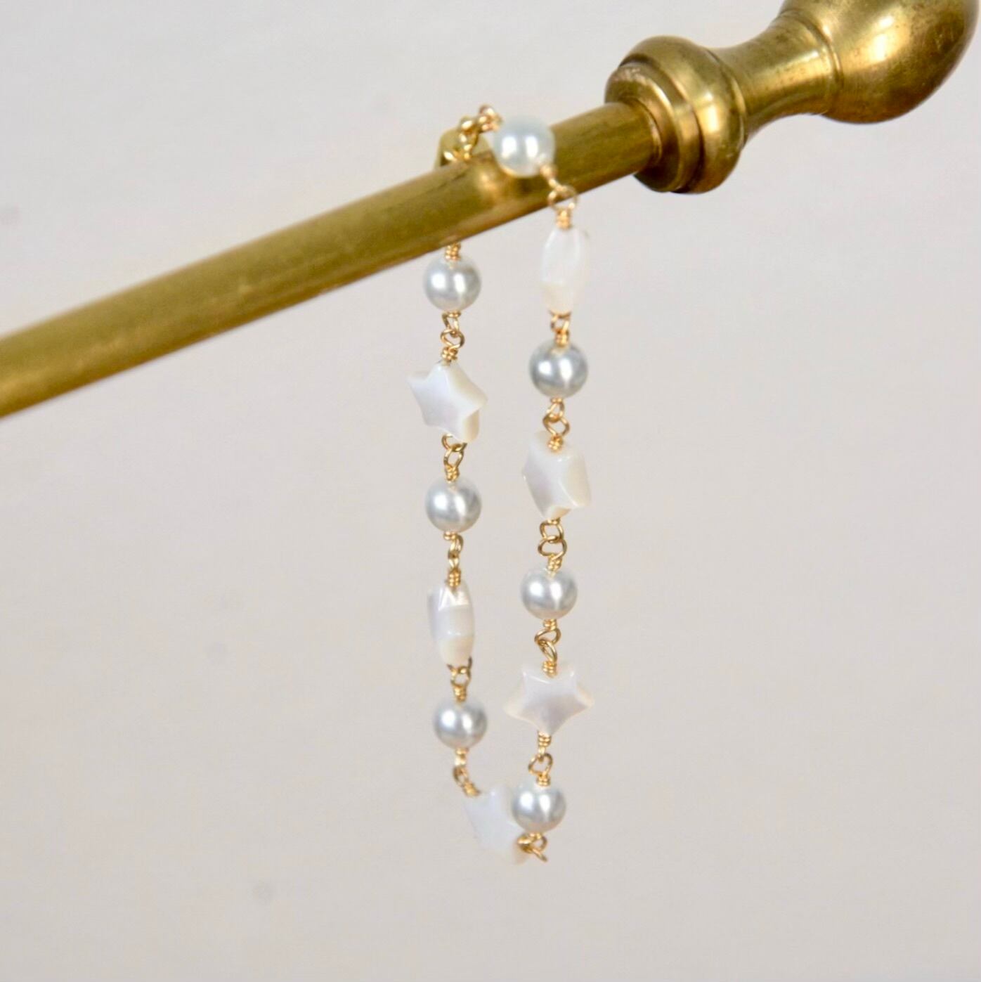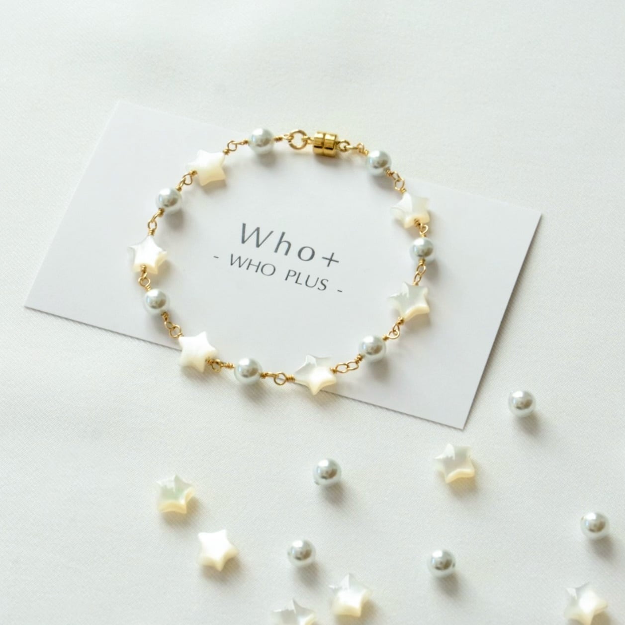 やさしいミルキーカラーの星型ホワイトシェル。クリスタルパールには、月明かりのような青白い輝きをもつ「ムーンライト」カラーを使用しています。