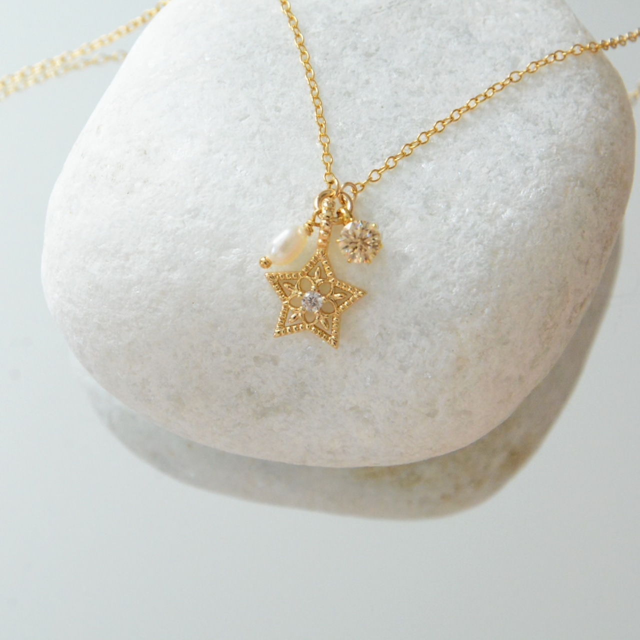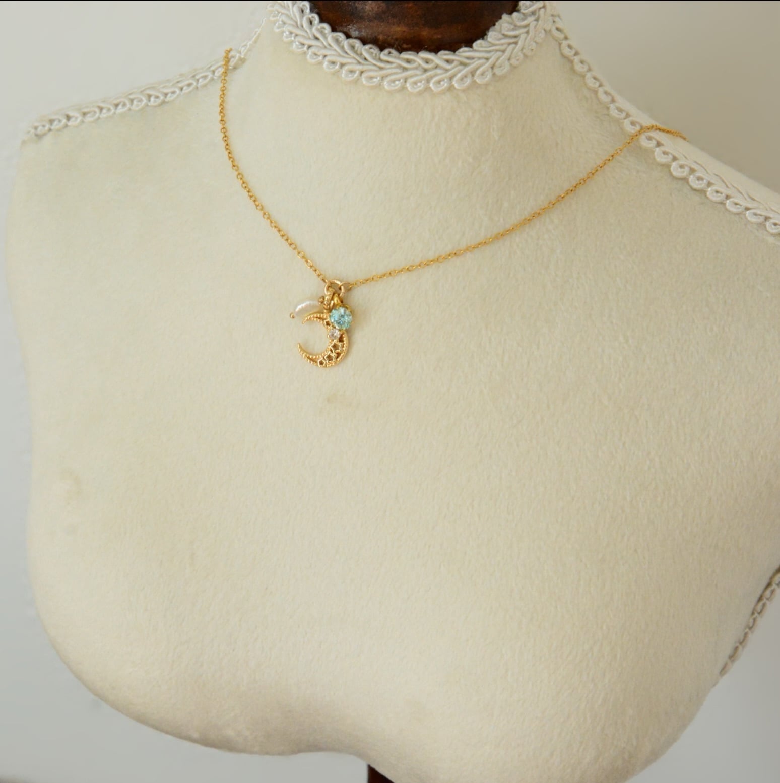 月・星型のゴールドチャームにモアサナイトと上質な淡水パールを組み合わせたペンダント。