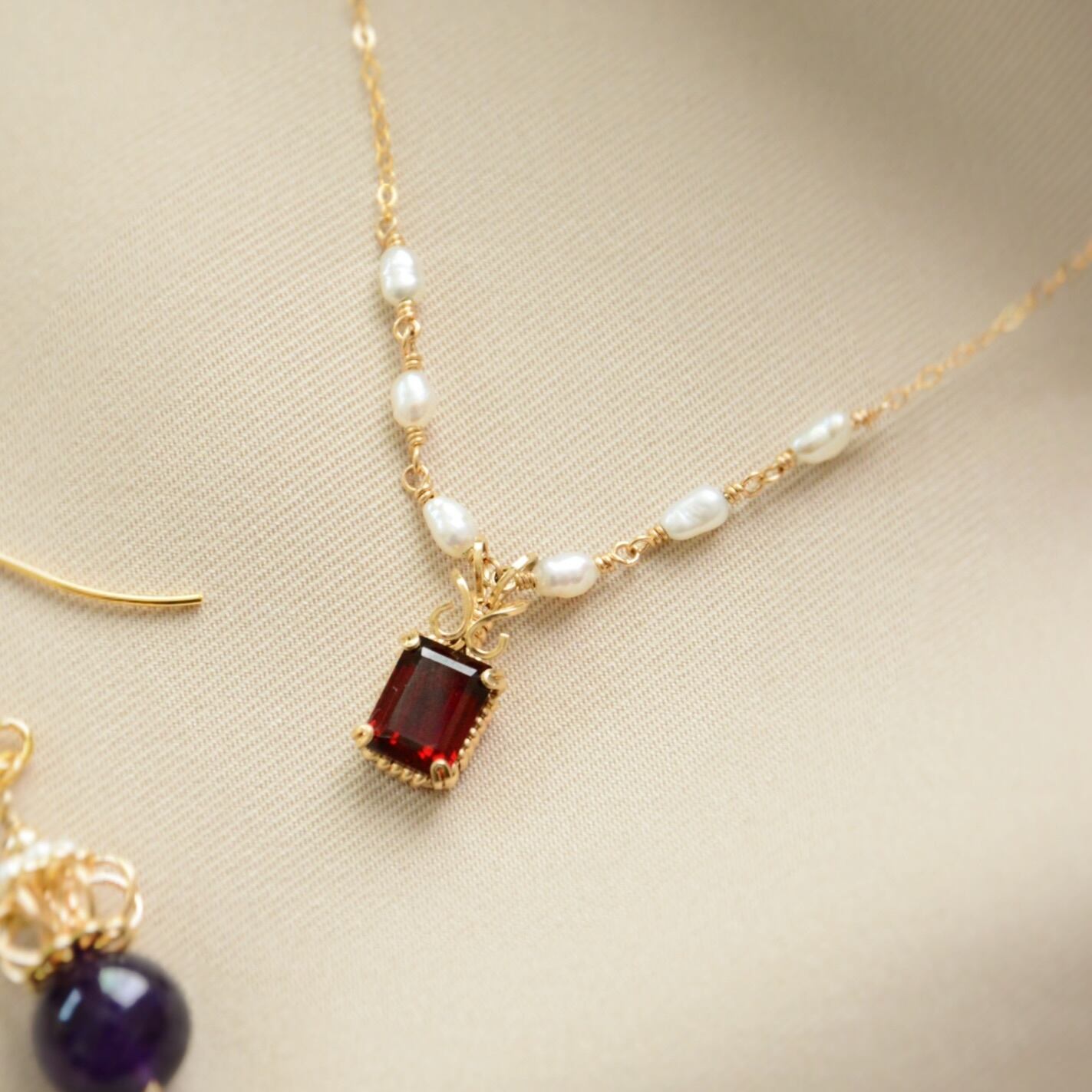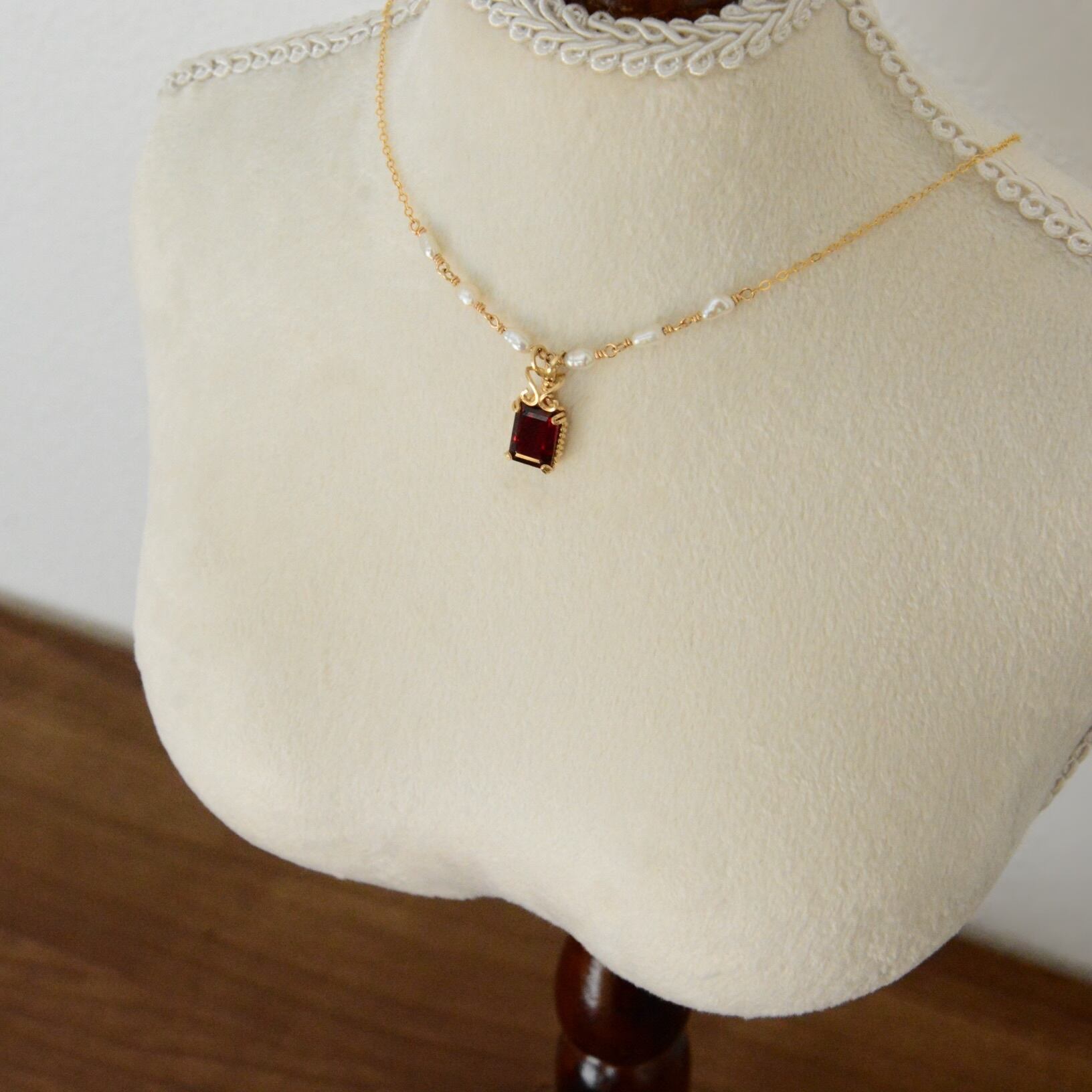 深みのある美しい赤色が魅力のモザンビーク産ガーネットに、やさしい輝きの淡水パールを添えたアンティーク調ペンダント。