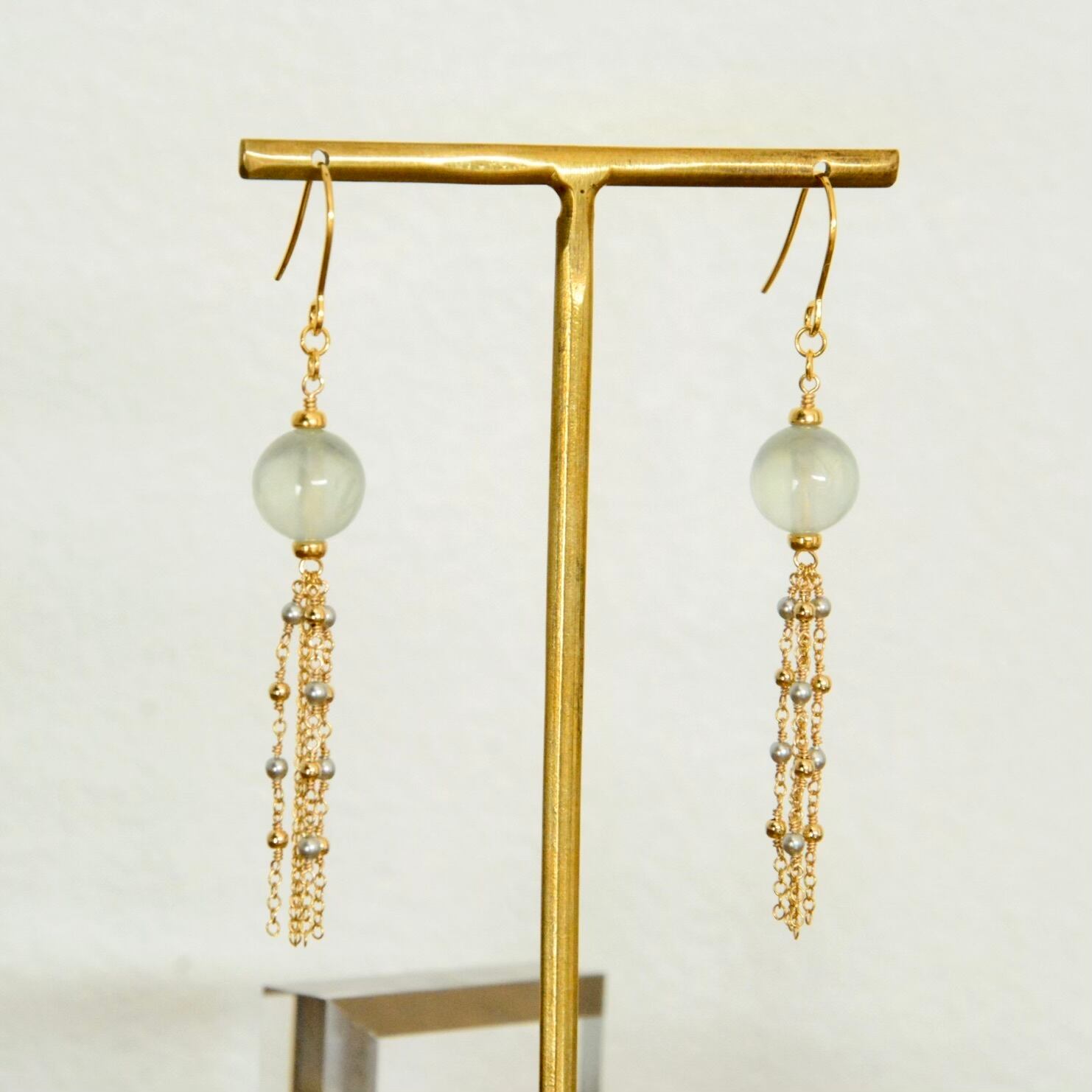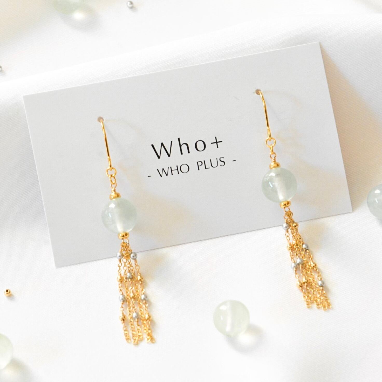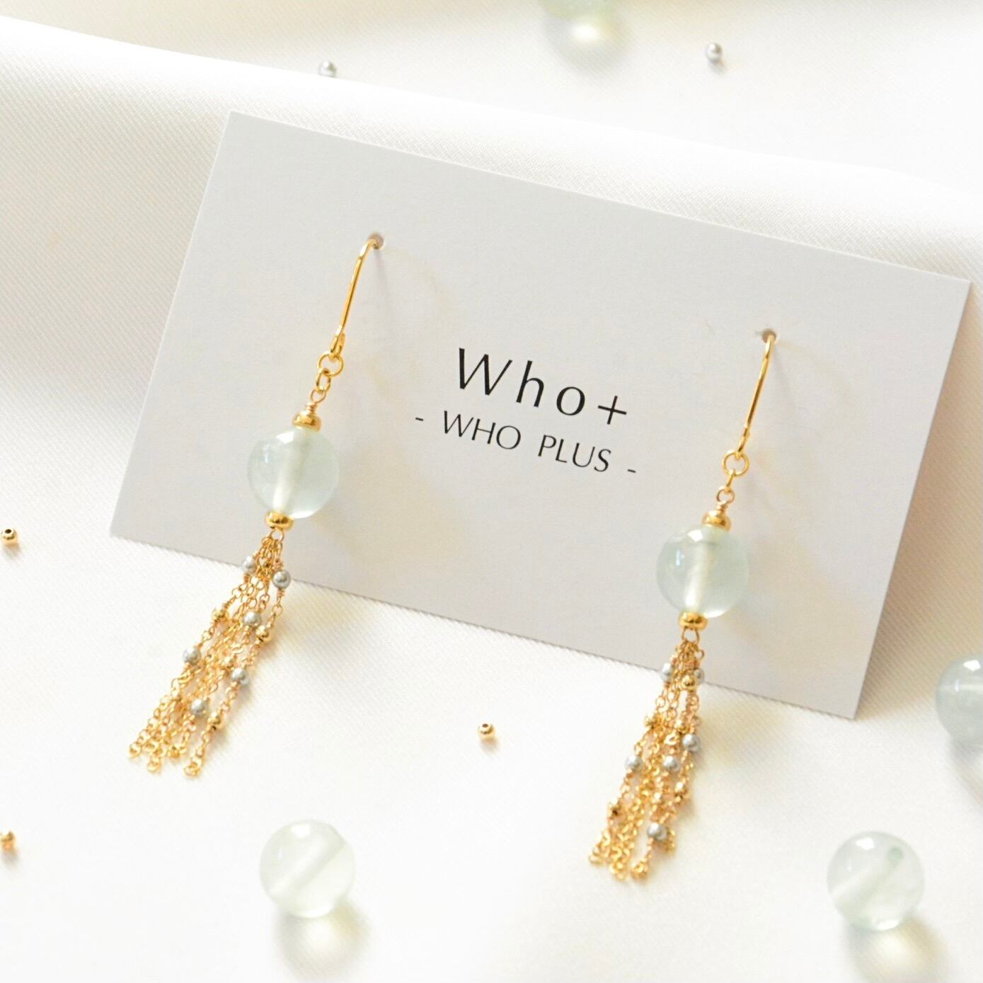 タッセルにはパールとメタルビーズをあしらい、動きに合わせてやさしく揺れ、顔まわりにやさしい輝きをプラスします。