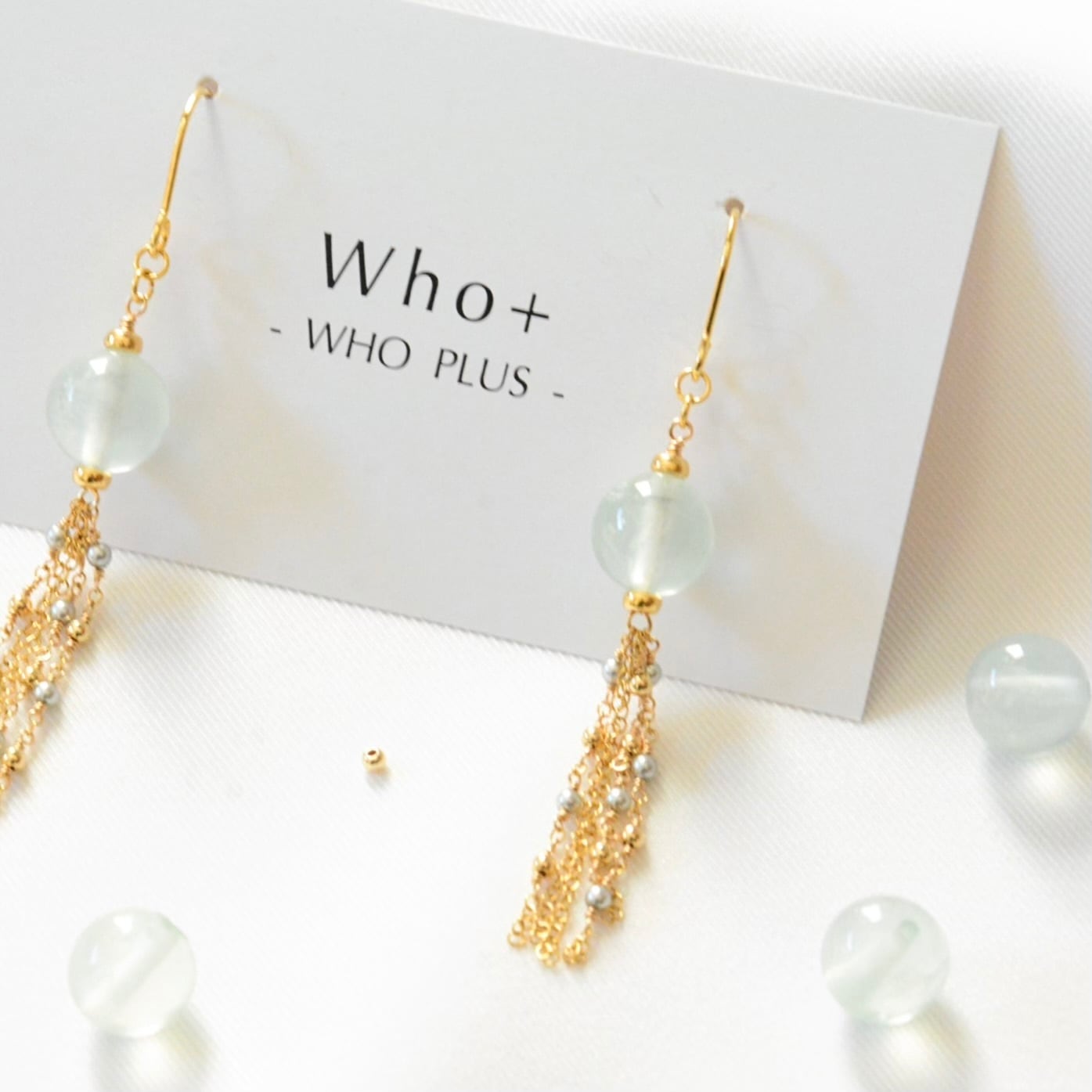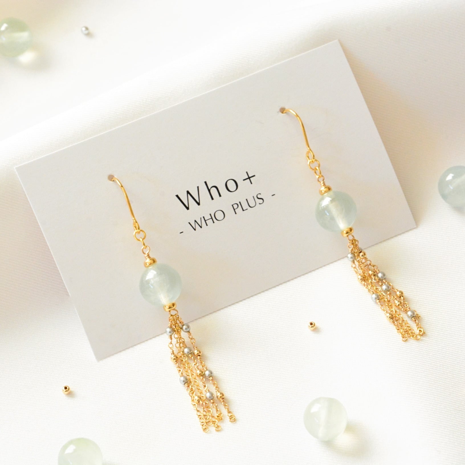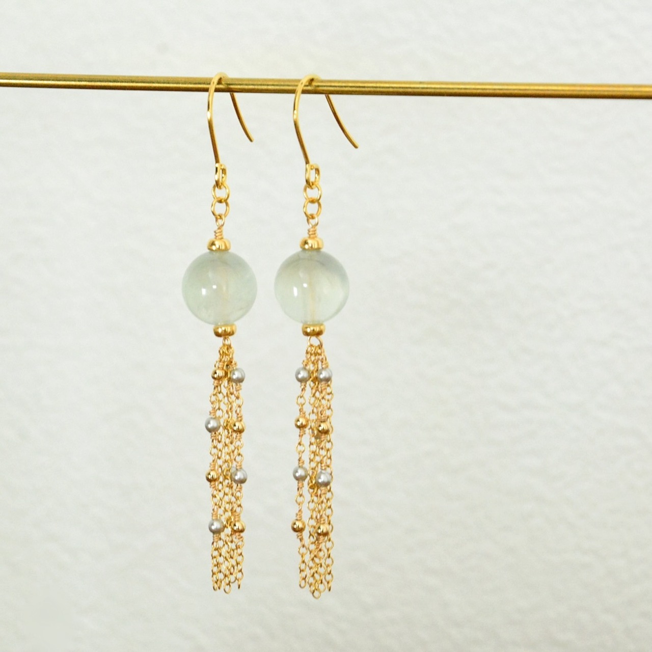 タッセルにはパールとメタルビーズをあしらい、動きに合わせてやさしく揺れ、顔まわりにやさしい輝きをプラスします。