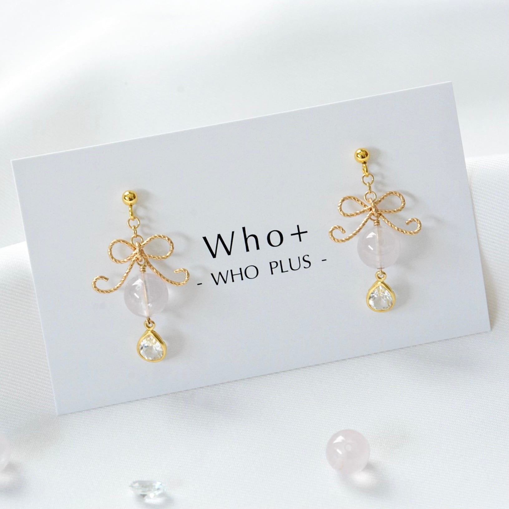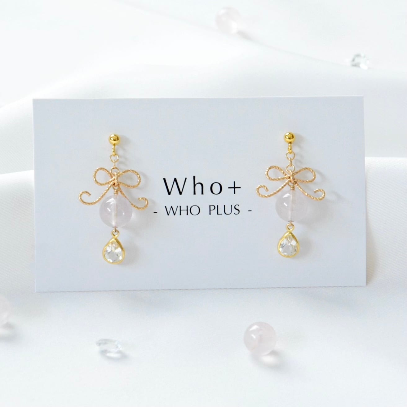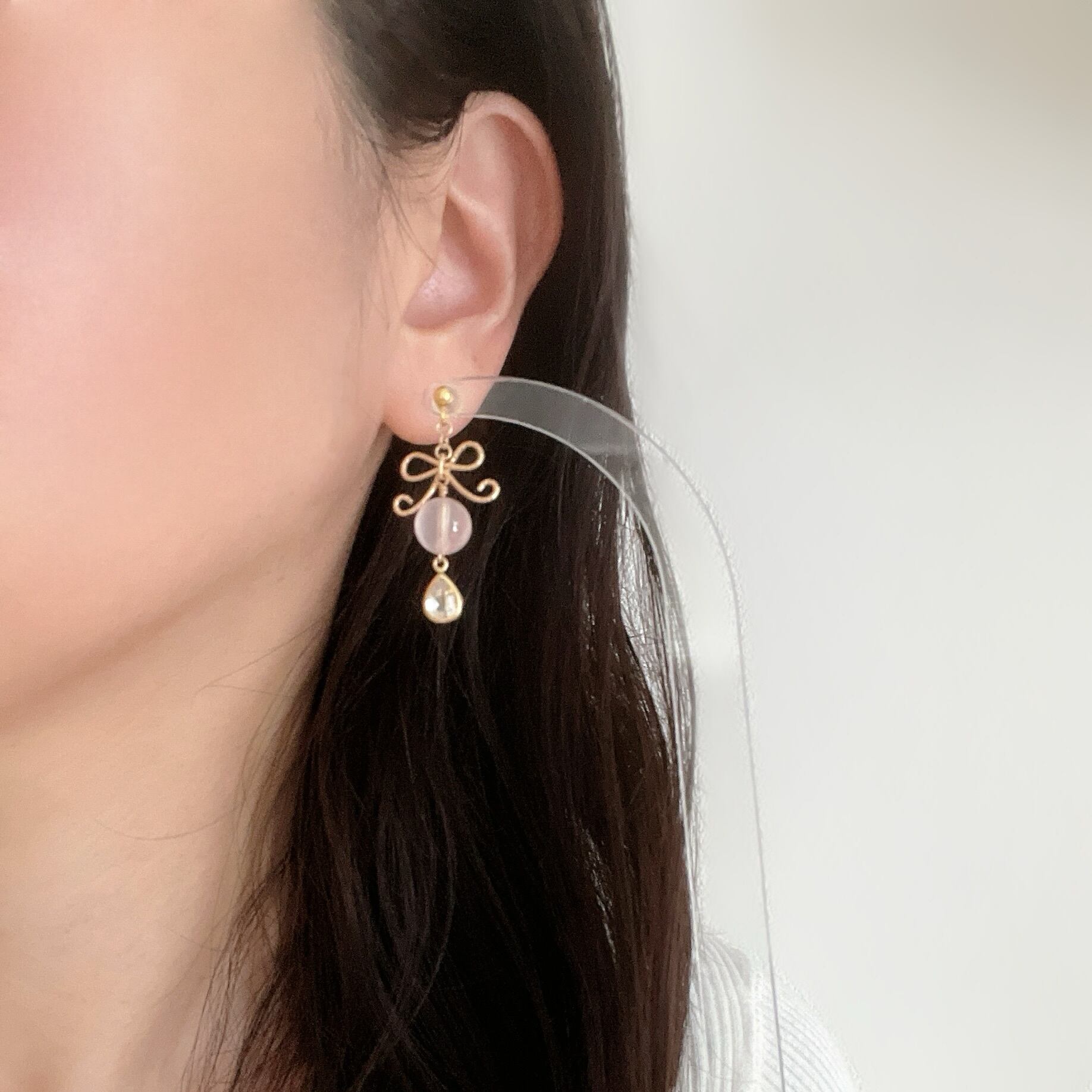 淡いピンクが魅力のローズクォーツは、透明度が高く上質なものを使用し、ほんのりとした色合いが肌になじみ、やさしく耳元を彩ります。
