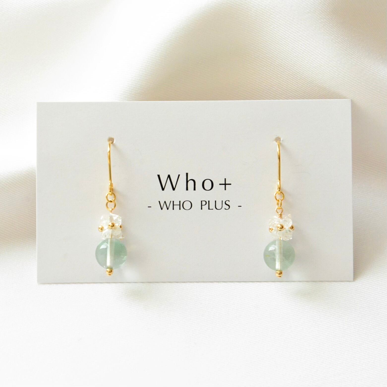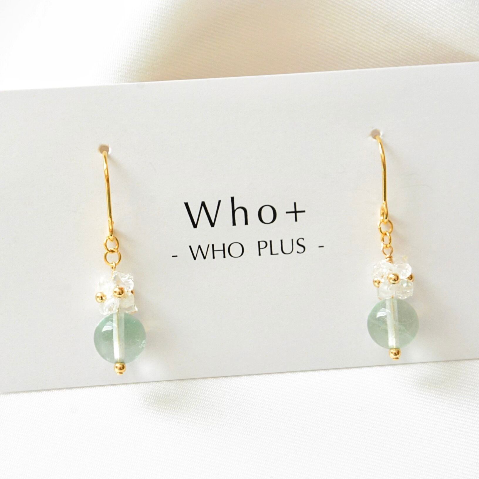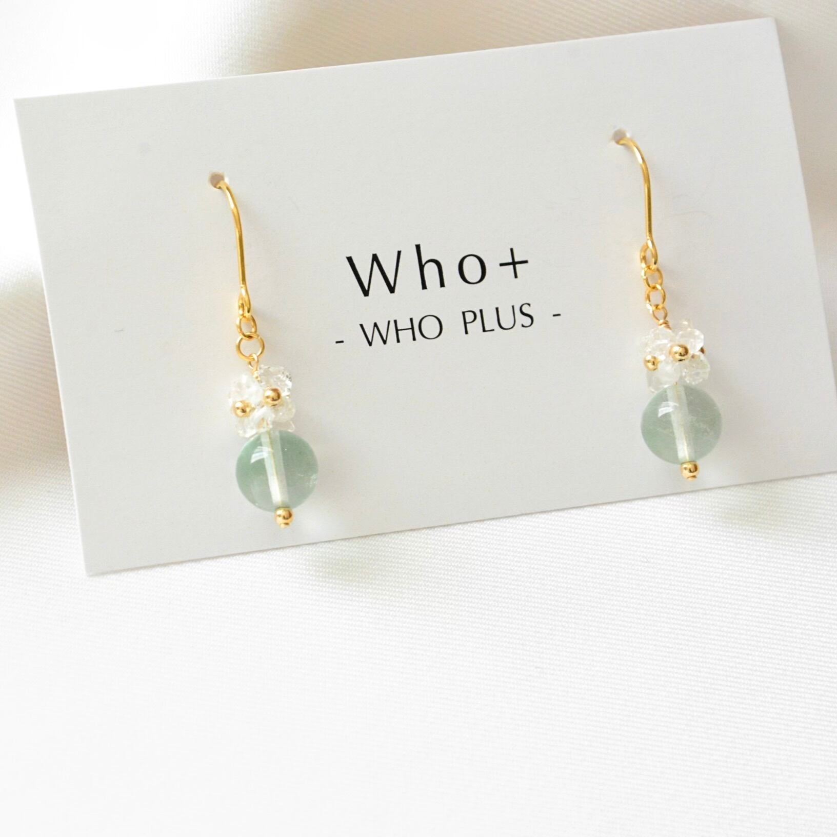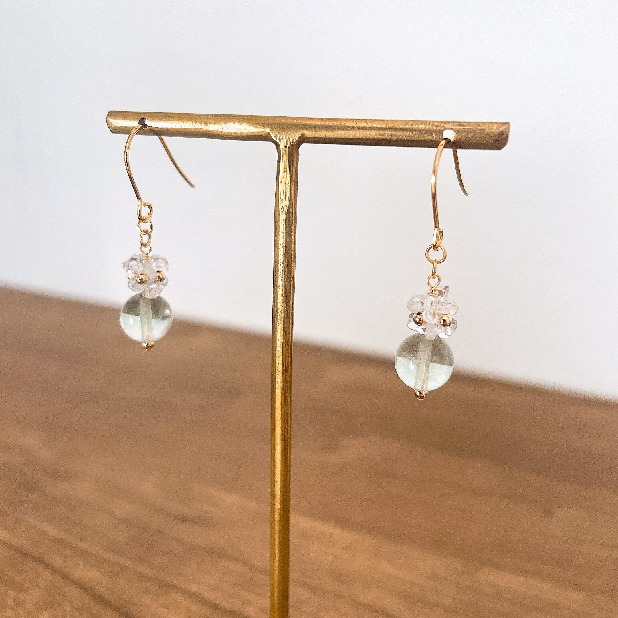 透き通るグリーンのフローライトにハーキマーダイヤモンドとジルコンをあしらった花冠を乗せた耳飾り。