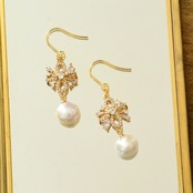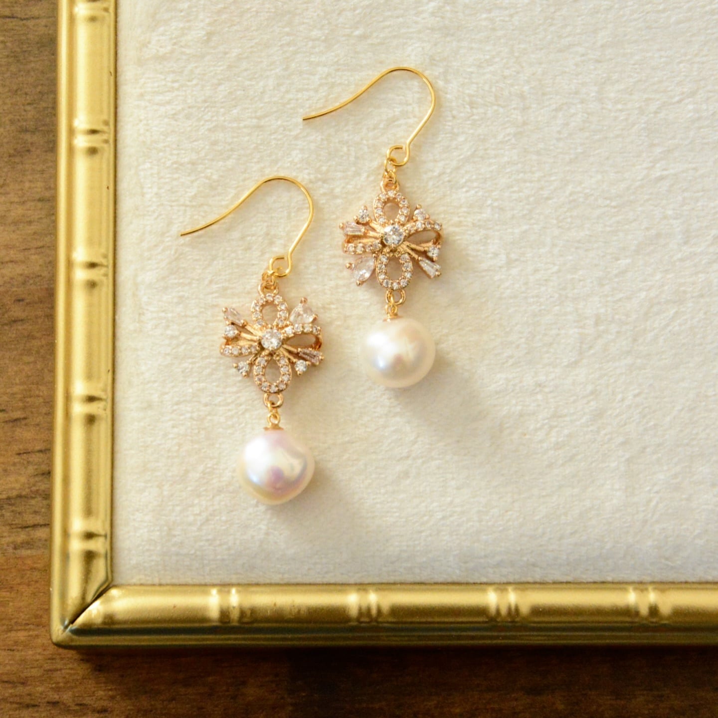 クラシカルなアンティーク調チャームに大粒の淡水バロックパールを組み合わせた上品な耳飾り。