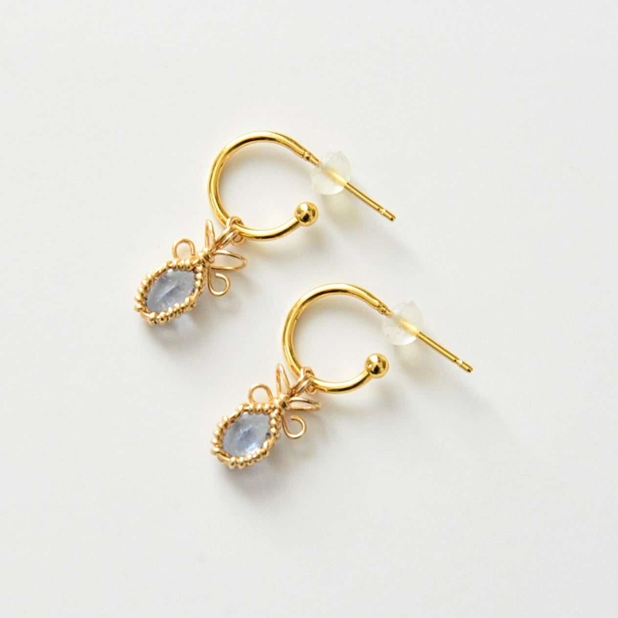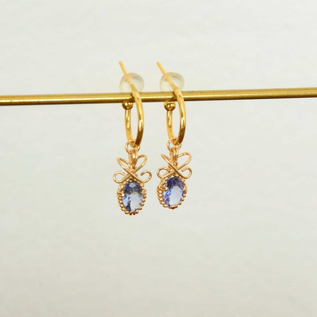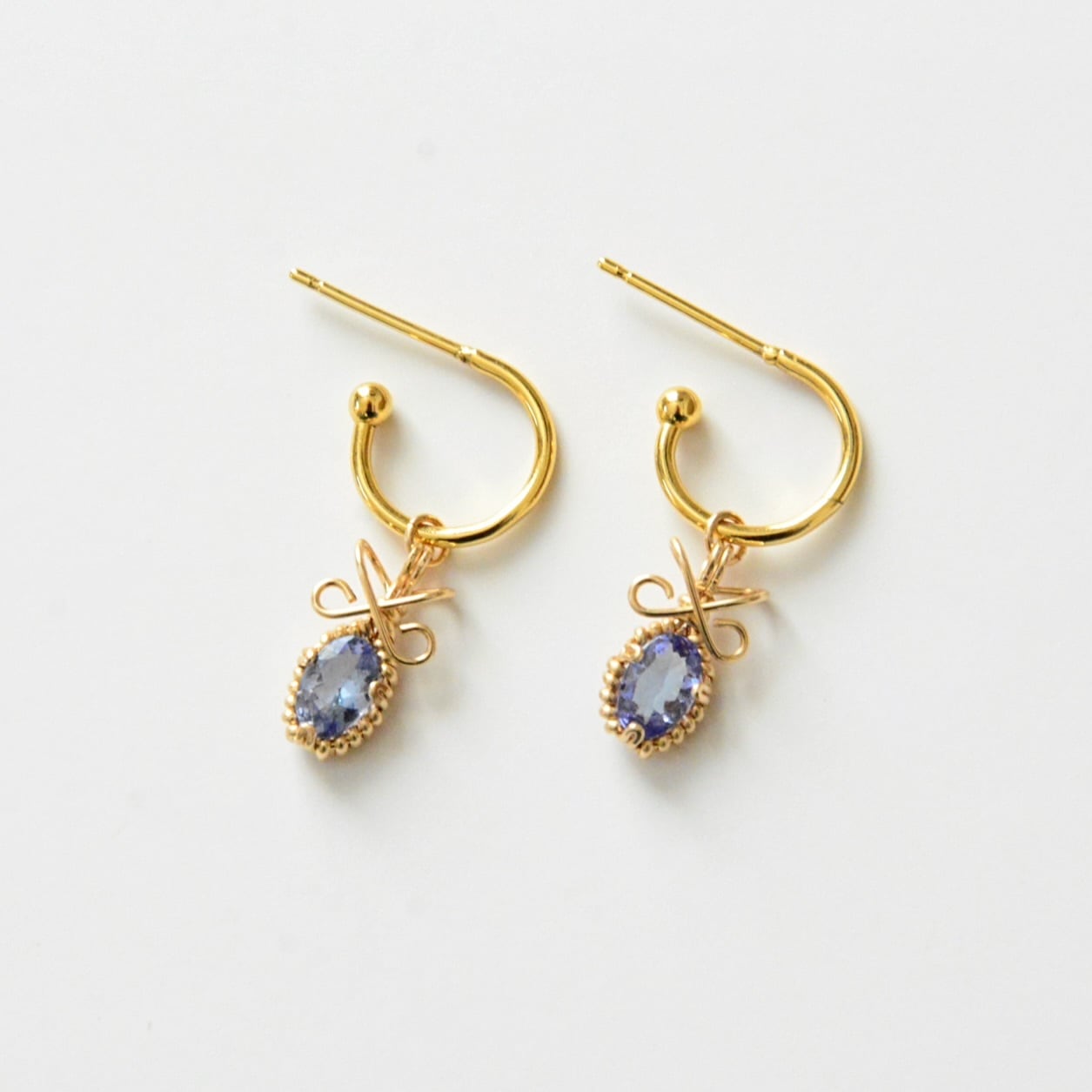神秘的な深いブルーが印象的なタンザナイトを14kgfワイヤーで包み込んだ耳飾り。