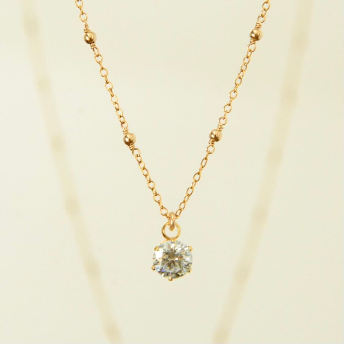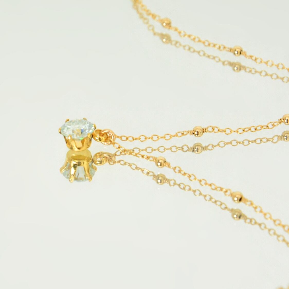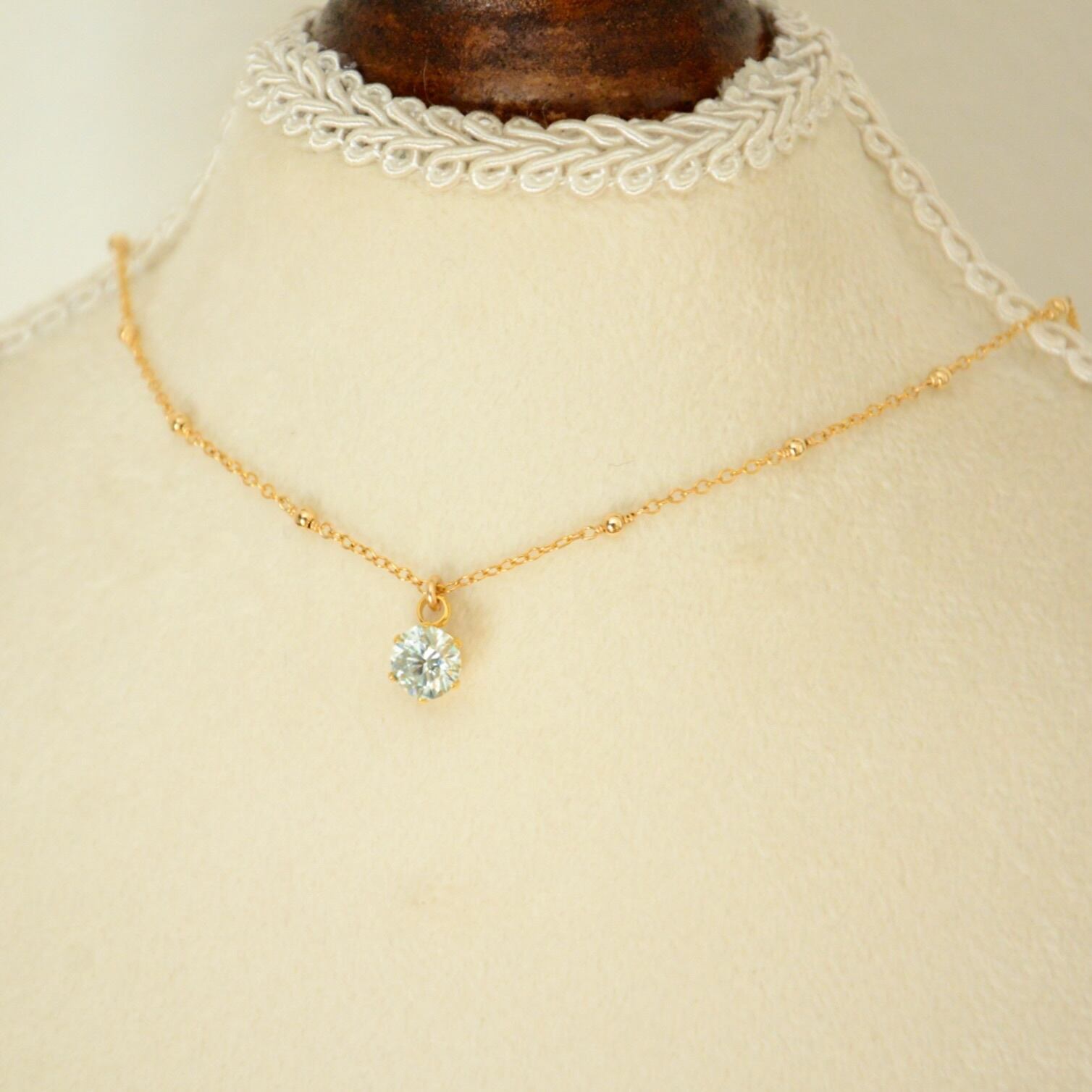 チェーンの間に14kgfメタルビーズをあしらったステーションネックレスに、モアサナイトを合わせた一粒ペンダント。