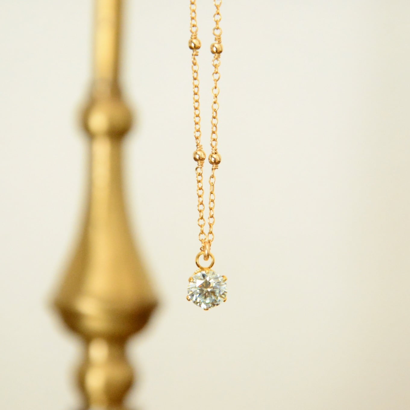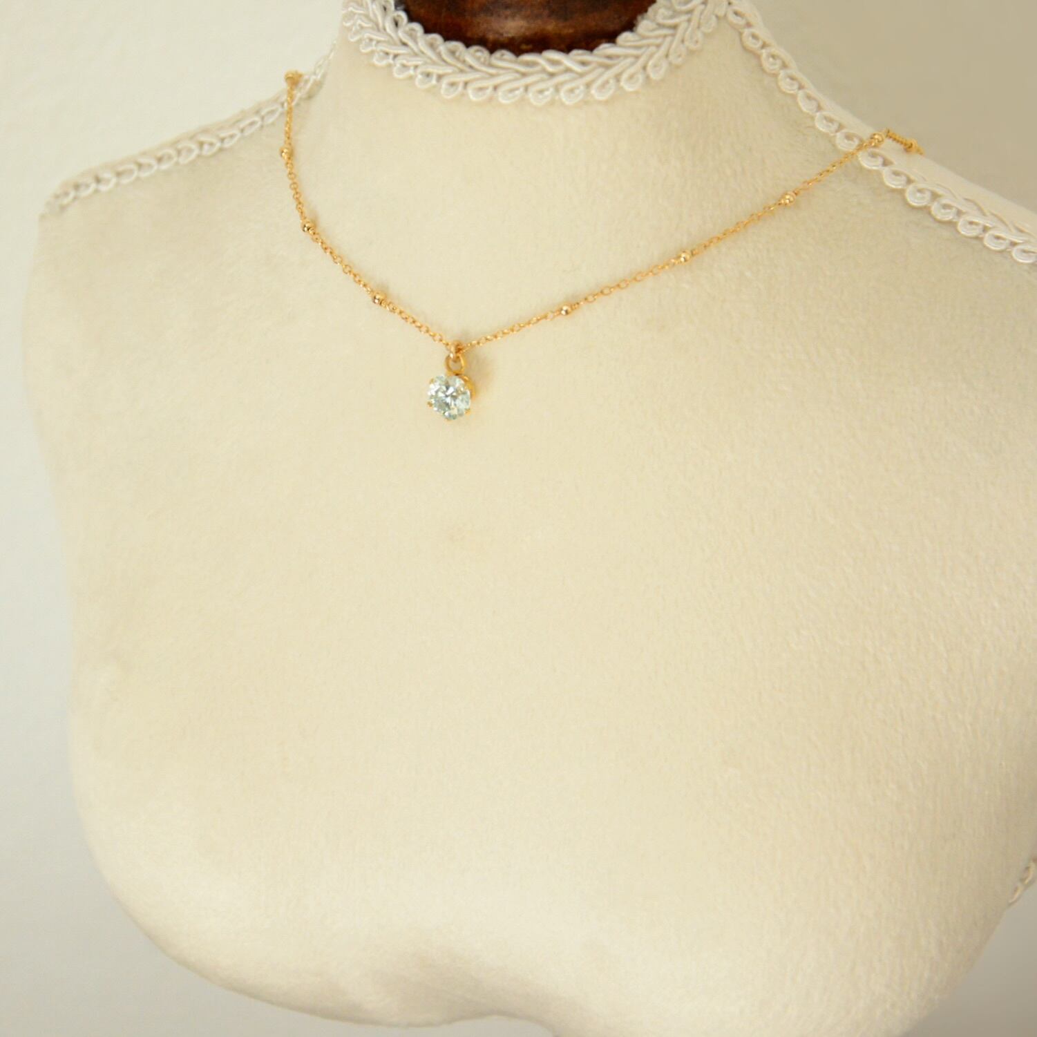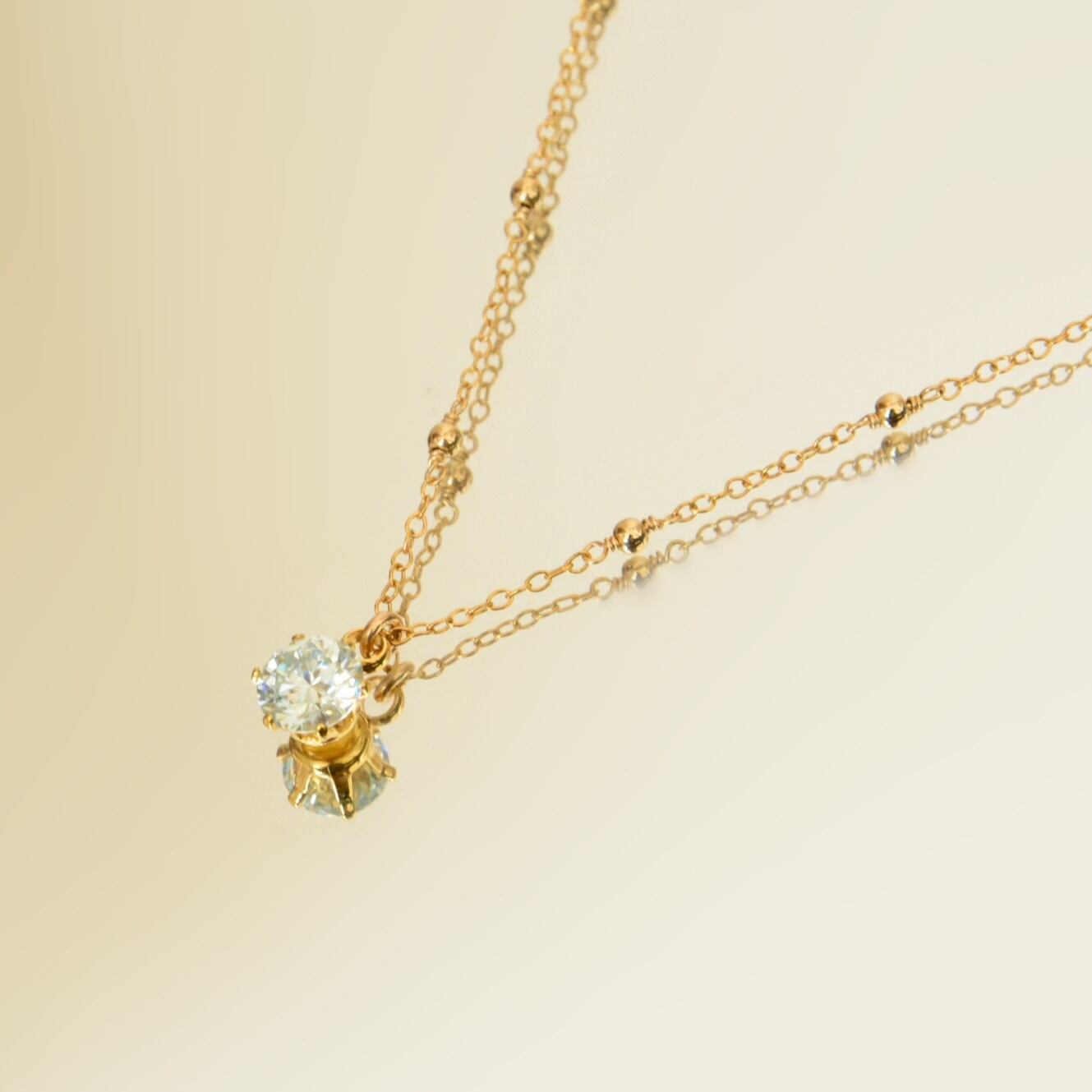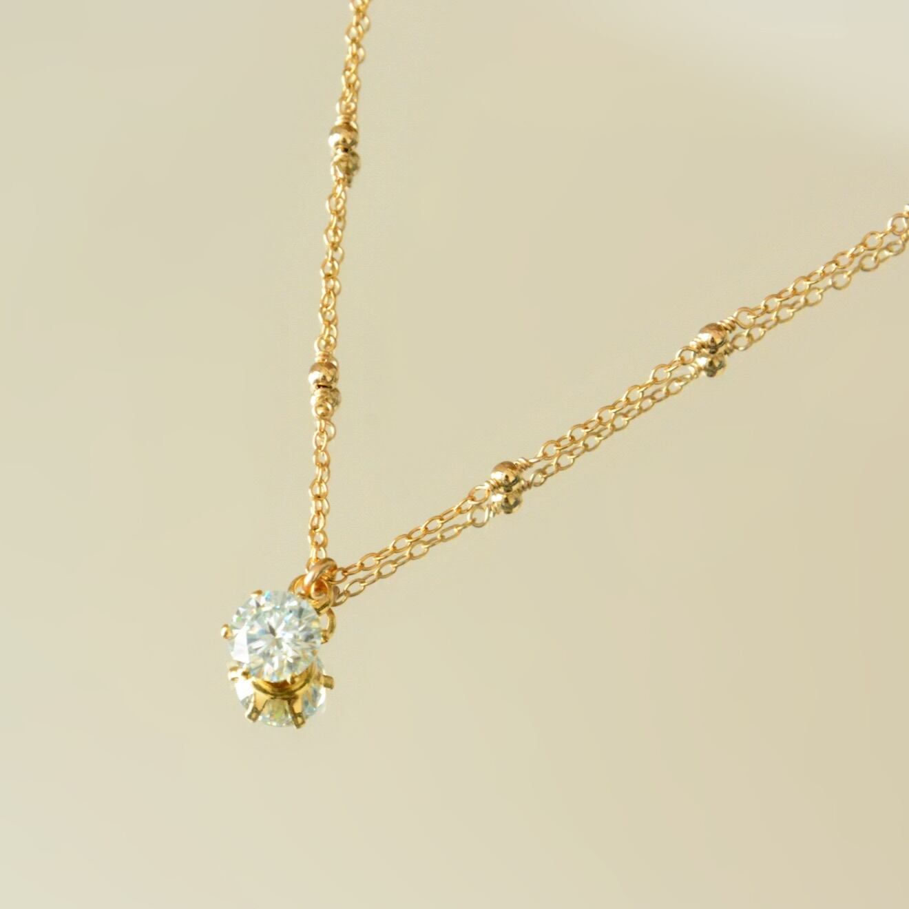 チェーンの間に14kgfメタルビーズをあしらったステーションネックレスに、モアサナイトを合わせた一粒ペンダント。