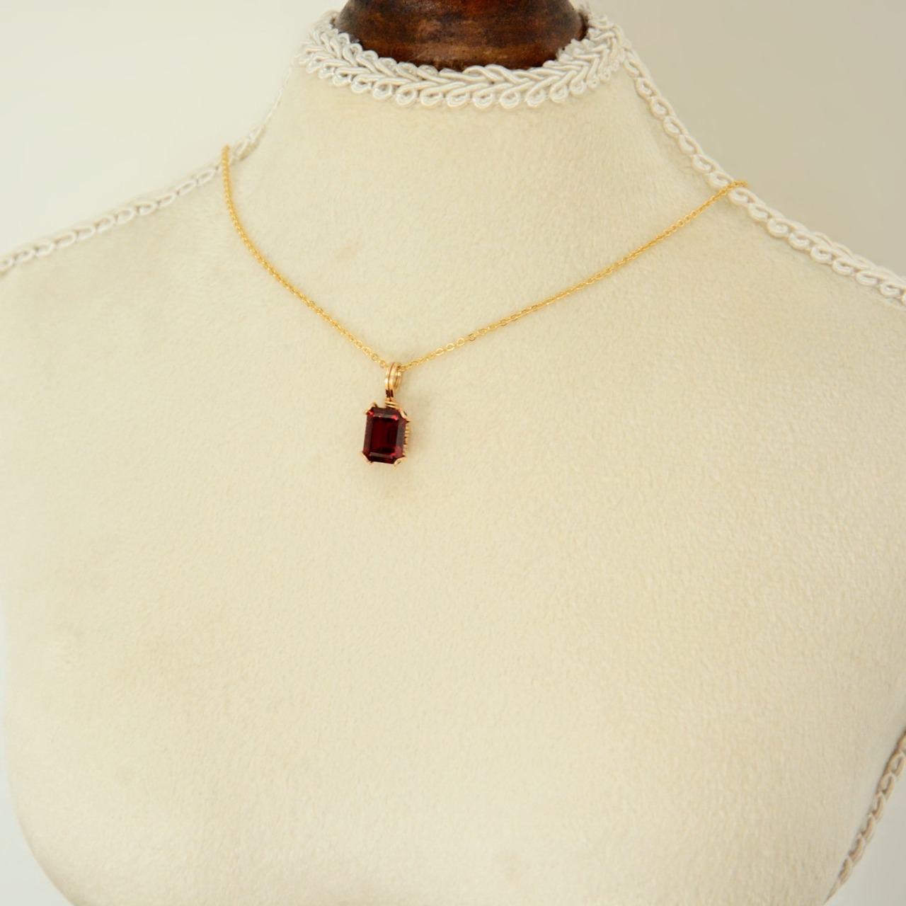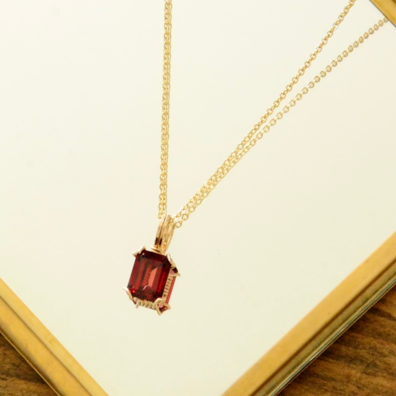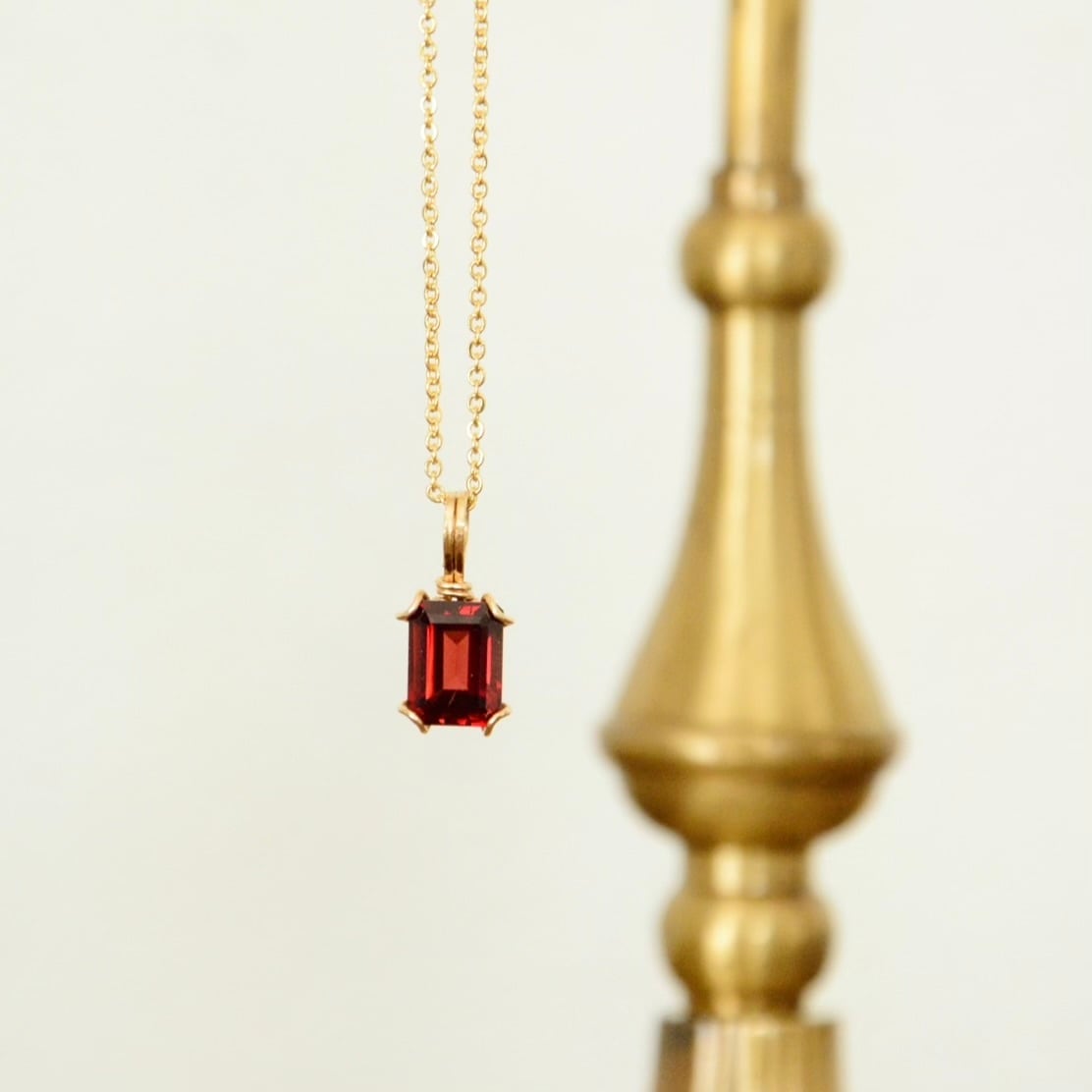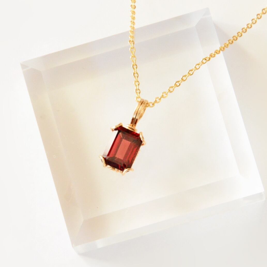存在感のあるレクタングルカットのガーネットは、身につけるだけで自然と目を引く上品な印象を演出します。